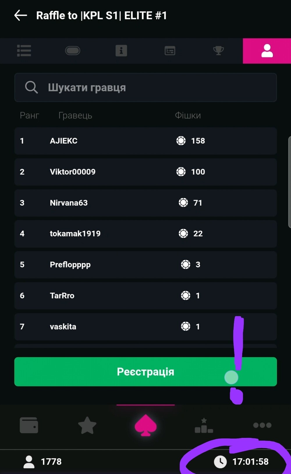 Як ви можете бачити зі скріну нижче, за 2 секунди до закінчення реєстрації в цьому турнірі моя кнопка ще не активована 🤭