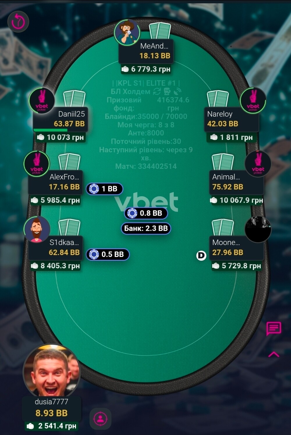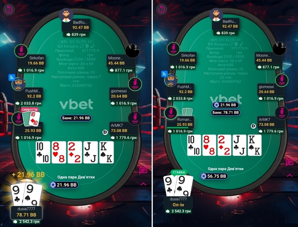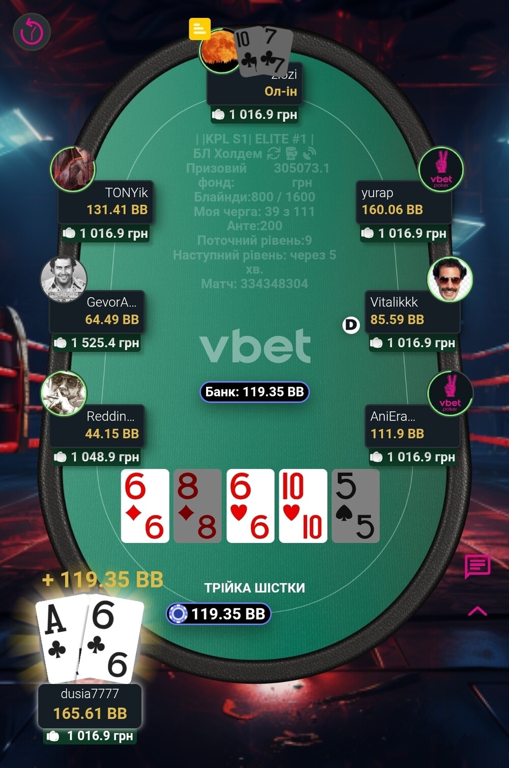 І так, якось гра дісталася фінального столу. Там дуже швидко, я не пам'ятаю такого, нас стало п'ятеро. Страшний і жахливий бабл😱. І от він ішов довго. Діма з Вакою, як чіплідери частенько давили стеком, в ми втрьох, з приблизно однаковими стеками, чекали хто ж з нас стане бабл боєм🥲. Не пощастило Креоністу. Як він казав карта у нього була напрочуд погана🤷. Після того, як він вилетів, його погана карта перейшла до мене🤣.