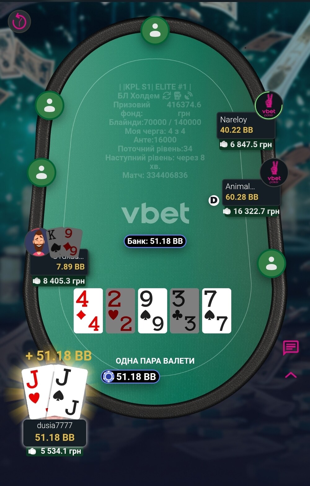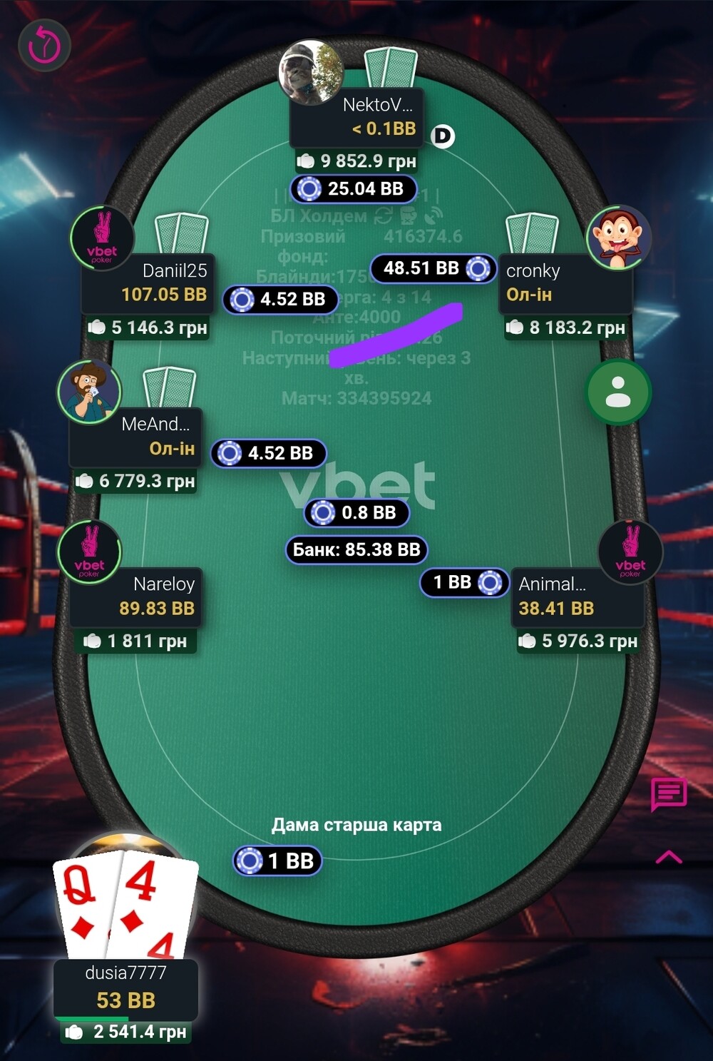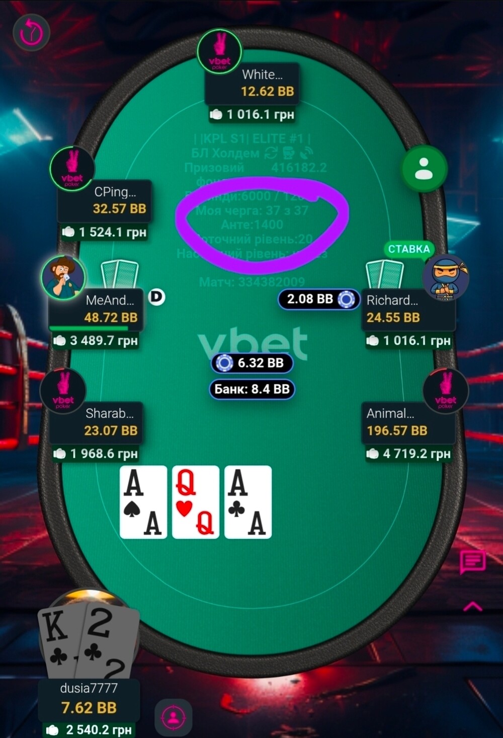 І так, якось гра дісталася фінального столу. Там дуже швидко, я не пам'ятаю такого, нас стало п'ятеро. Страшний і жахливий бабл😱. І от він ішов довго. Діма з Вакою, як чіплідери частенько давили стеком, в ми втрьох, з приблизно однаковими стеками, чекали хто ж з нас стане бабл боєм🥲. Не пощастило Креоністу. Як він казав карта у нього була напрочуд погана🤷. Після того, як він вилетів, його погана карта перейшла до мене🤣.