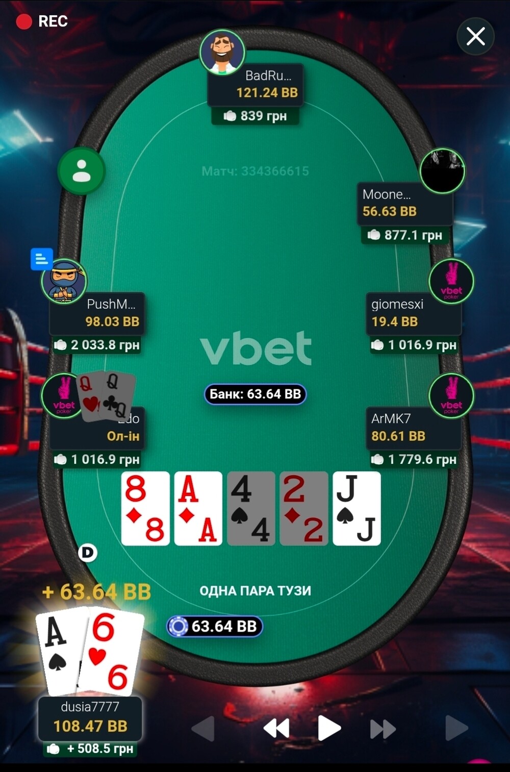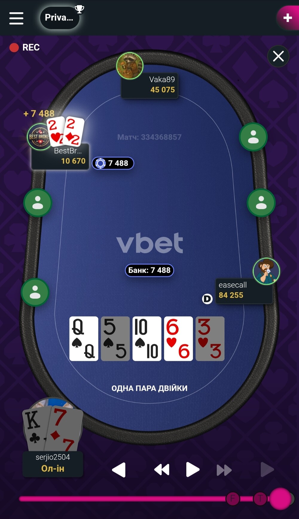 Тут на велику ставку Діми, по ріверу, я запушив в надії на кол. Але Діма зіграв, як мудрий гравець, скинув карти👍. Було, ще виграних, пару невеликих банків, а то все фолд🤷