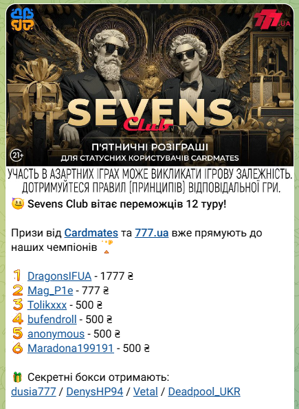 🎯 Щоп’ятниці разом із 777.ua ми проводимо окремий закритий розіграш призів - лише для користувачів, які мають статус на Cardmates.ua.
