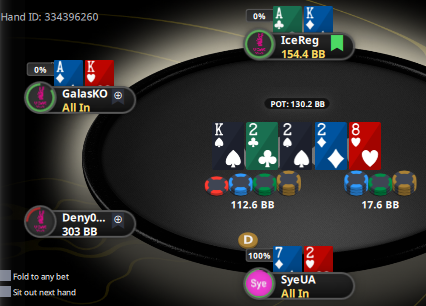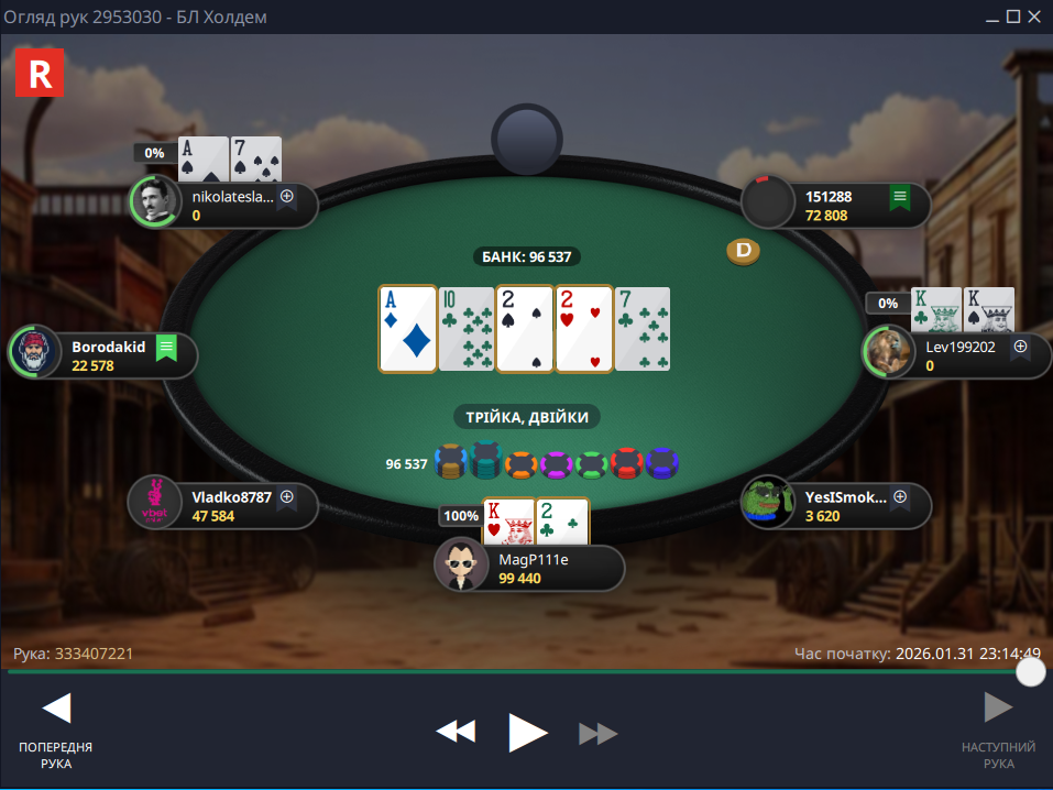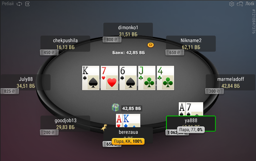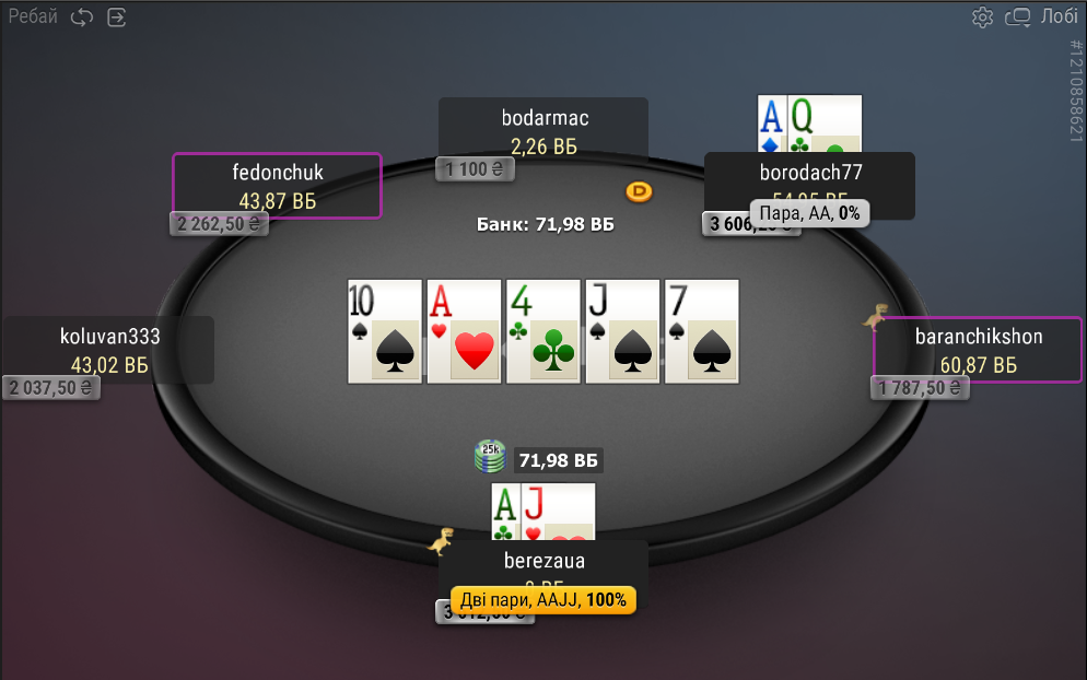Наступна спроба. Лімплю з першої позиції 72, гравець за мною рейзить, а з малого блайнду прилітає пуш. Тут вже навіть не сумнівався — кол! Гравець за мною теж кол! Що відбувається?!