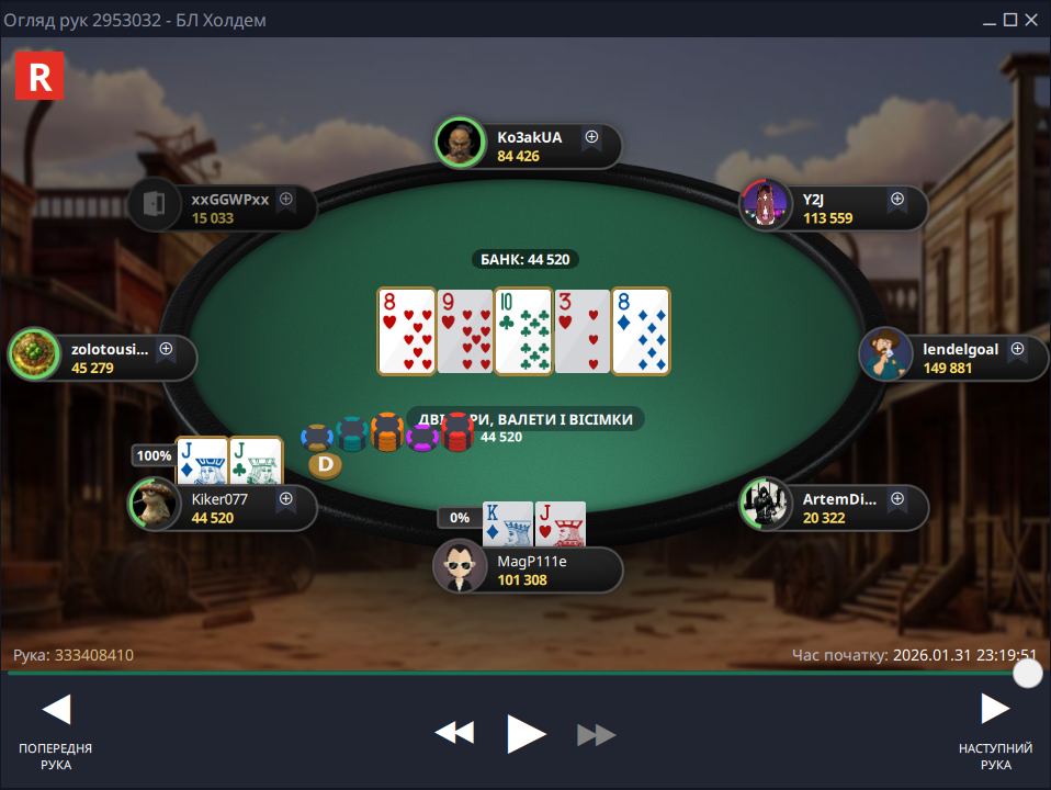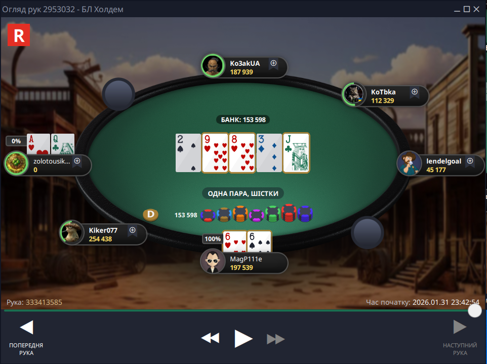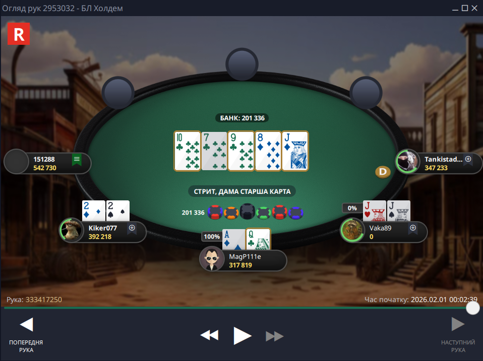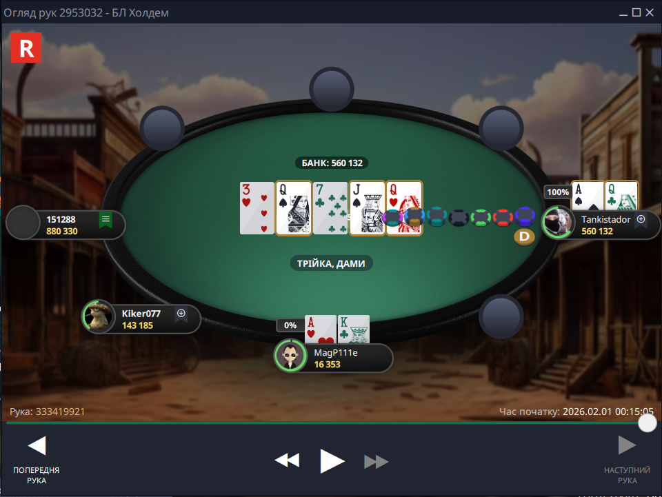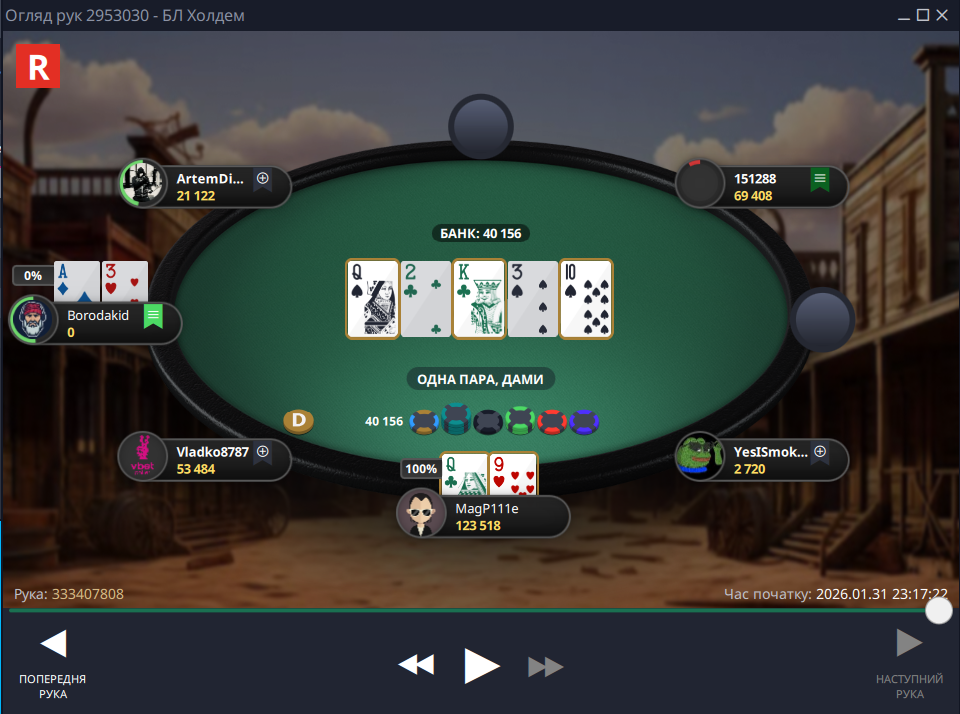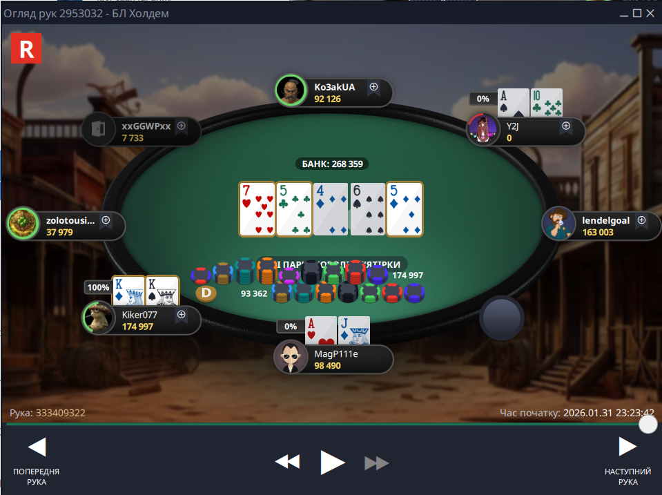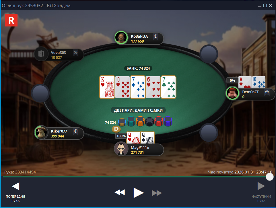 Фінальна роздача була до болю банальною, я запушив – опонент ризикнув і натиснув кол, щоб забрати солідний баунті за мою голову, але цього разу Фортуна від мене відвернулася: