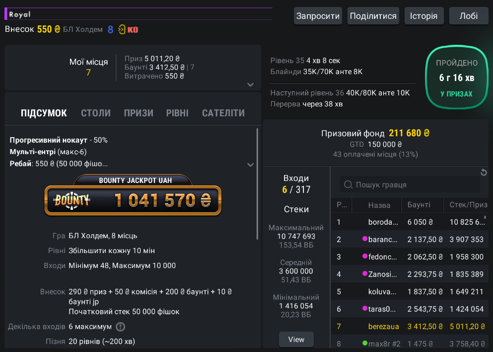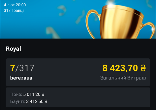 Вчора мені знову вдалося трохи підзаробити покером, а саме, я зміг посісти 7-ме місце в турнірі Royal за 550₴ на PokerBet: