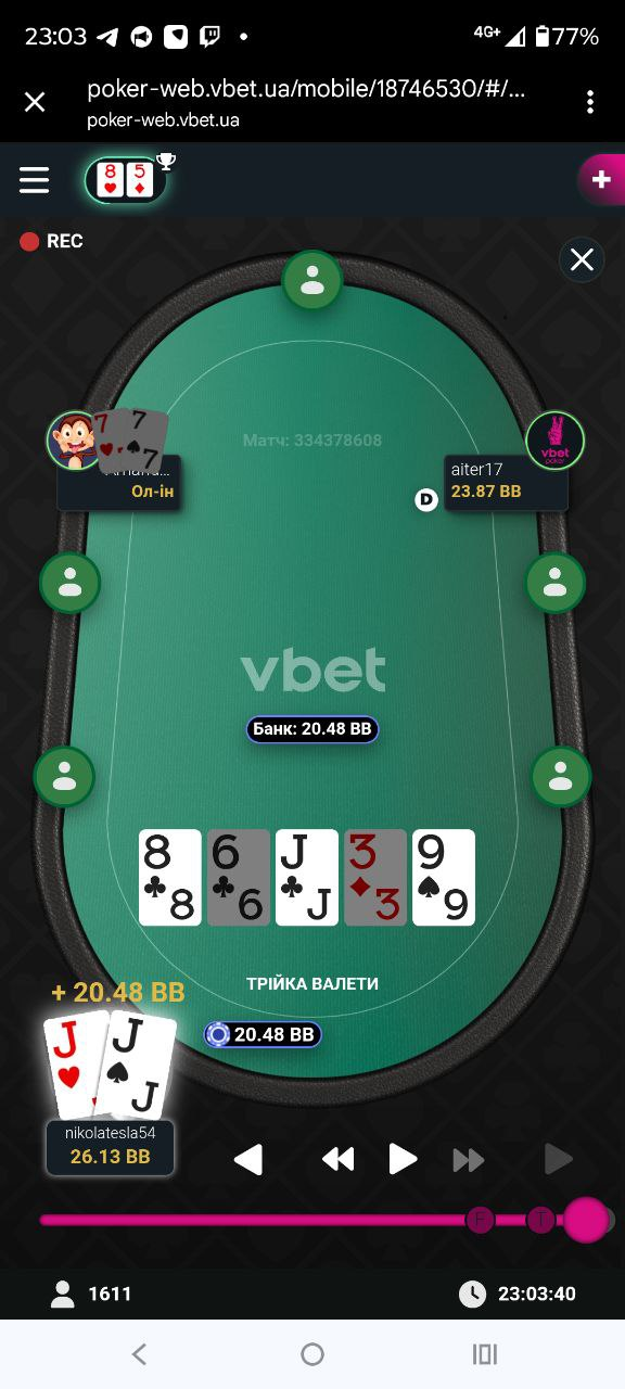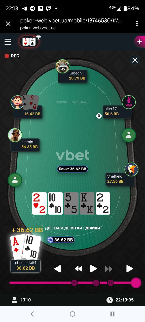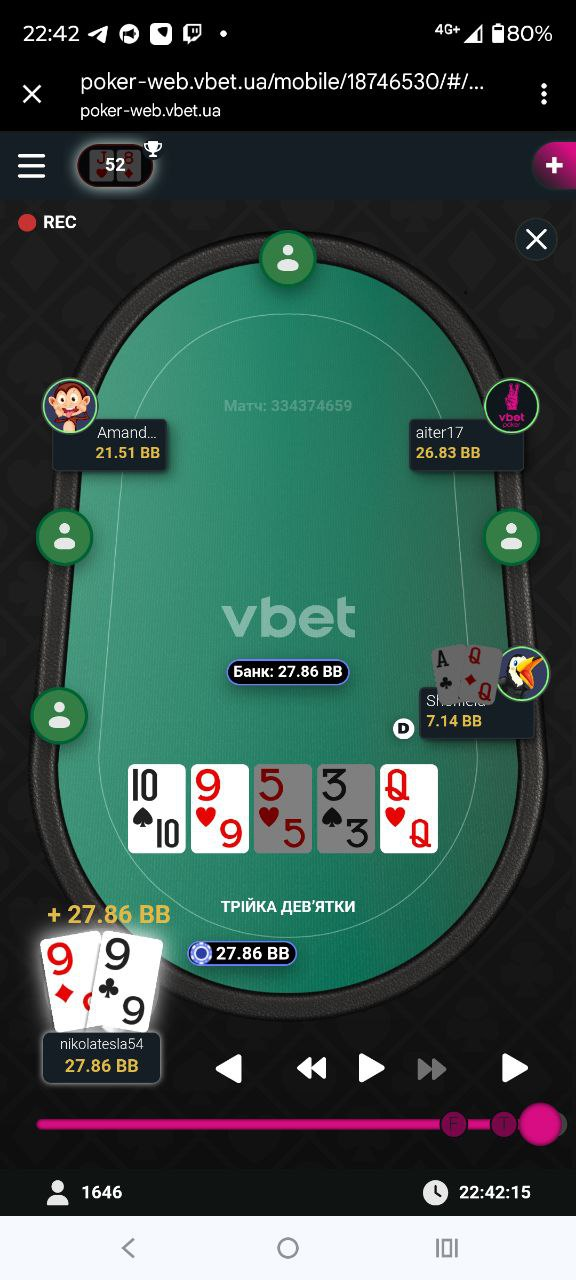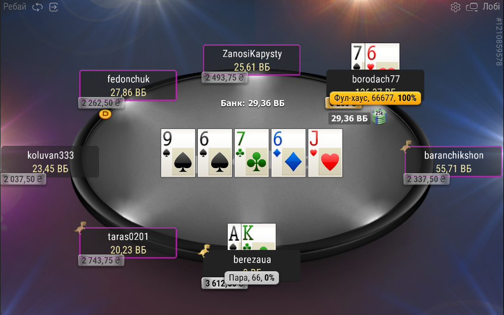 В даній роздачі мені дуже пощастило зловити дві пари і, по факту, переїхати опонента (виставилися на тьорні):