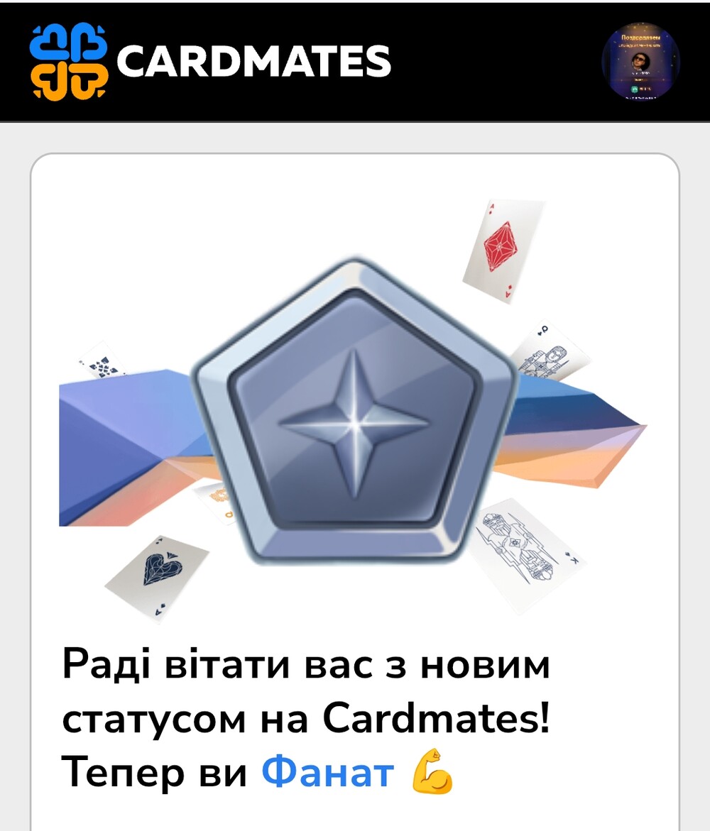 Сьогодні отримав новий статус на Cardmates — Фанат.