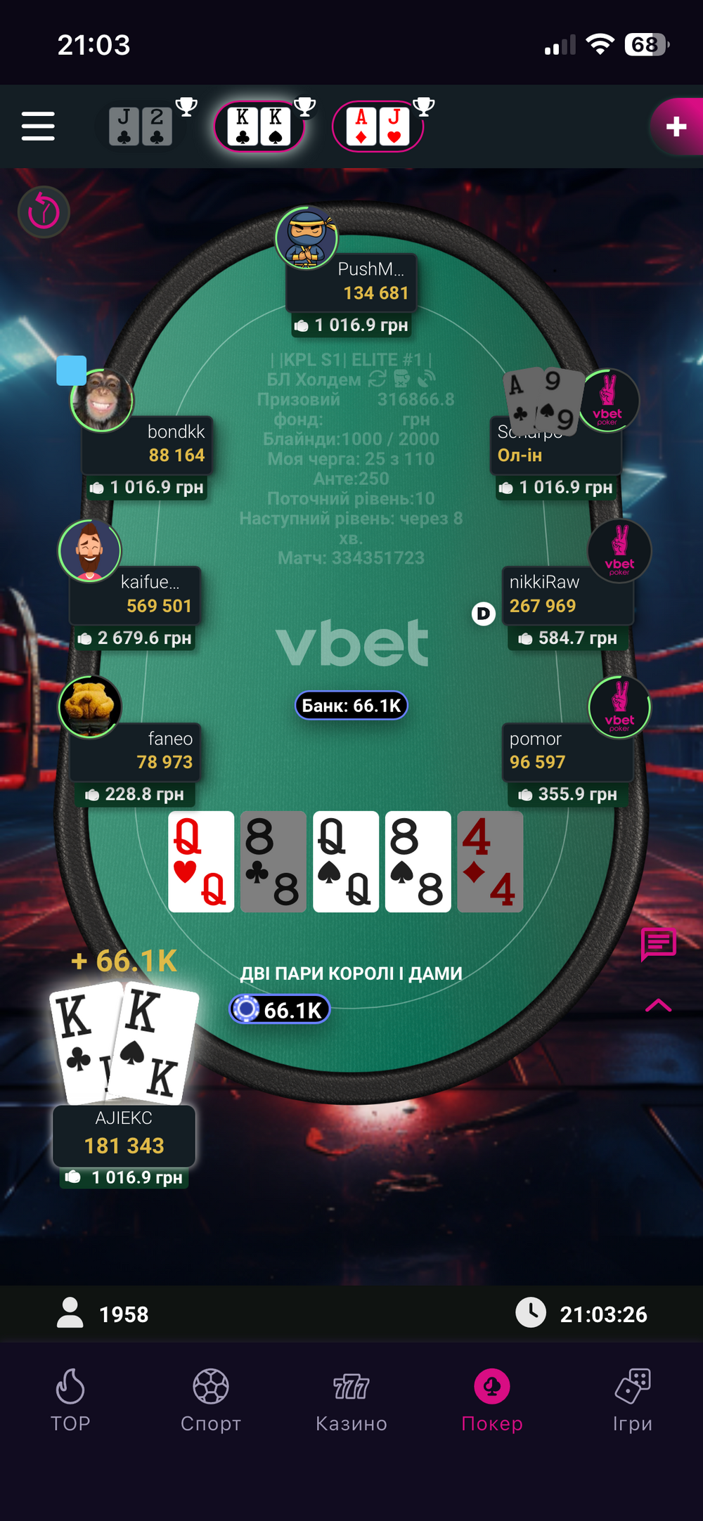 Ця роздача дала мені гарний стек, але я використовував його і надалі задля лудки. Топ нок пішов досить швидко, але 3к ще залишалися у грі, як і декілька «тисячок». Ось декілька роздач з моїми «здобутками» 🤑( Двічі майже зміг "подолати" у олині Кєка, але він був на коні - забере топ2 нокаут і вийде чіпаком на фіналку).