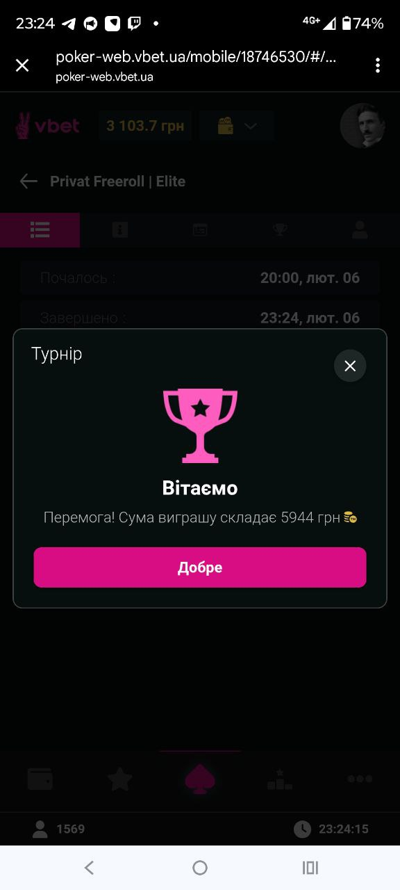 Ну так і що? Фантики ми здобули, але ще треба їх конвертувати у реальні гроші. ТМки я завжди мию в спінах – нервів це коштує нереальну кількість, але я не маю іншого вибору, оскільки в турнірах на вбеті особисто мені взагалі ловити нічого, в тебе кожен раз за столом 2 хххТопРеги і 4бебішарки і тд – полудити виграний квиток із задоволенням, але от за свої кошти ні, дякую. Не знаю чому, але в спінах вбет мене сильно не «карає» за мій рівень гри і я кожного разу відігрую тмки в 0, хоча мої навички точно цьому не відповідають. Так і цього разу, переміг один х10 спін і три х5, що дозволило мені поставити на виведення 5.6к гривень – для мене максимально задовільний варіант.💹
