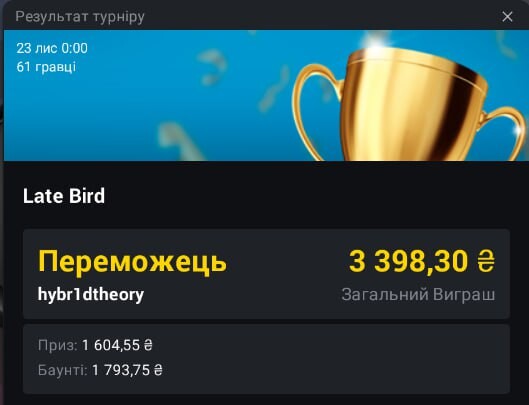І тут сталося, щось дивне. ГВЧ зламався, чи то пан Веб3 знайшов горщик із удачею, але йому поперла карта, як із рогу достатку. Хлопці не дадуть збрехати, та і він я думаю поділиться цим у своєму дописі. Отже він почав вибивати опонентів один за одним. І так я потрапив у призи. І залишилося нас четверо. Три Легенди і із фішками, як кіт наплакав і чіпак Веб3. Переможець уже, майже, був відомий. Але ми билися, як леви, до самого кінця. Залишилося нам трьом розподілити місця. І так виявилося що мені дісталося найвище місце серед Легенд.