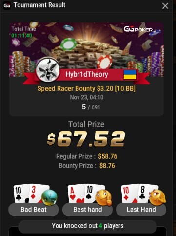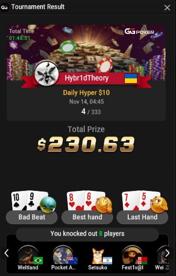 Ця Хомка складалася, як завжди тяжко. Сильні гравці і сильна гра💪. Рейзи, блефи і весь набір покерного гравця був присутній. Я гравець-любитель, я б навіть сказав дуже любитель🤣, тому багато із цього набору, я навіть назви не знаю😱. Тому і грати завжди тяжко. Але це не заважає іноді показувати гарні результати👍