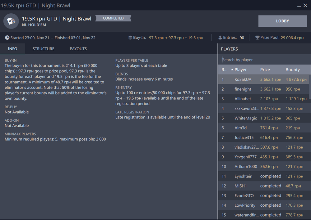 В цьому турнірі за 215 гривень я виграв 8540 гривень, що склало аж 40 бай-інів і такі солідні призові для мене виявилися досить неочікуваними, бо зазвичай в таких невеличких турнірах переможець забирає приблизно 25-30 бай-інів😉
