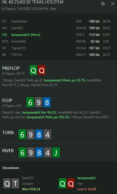 ну а це роздача сама мінусова в мене вийшла історія про те, як мене риба спіймала 😅 ну по роздачи ні про що не шкодую, у мене мало було шансів, коли здають такий скам 😕