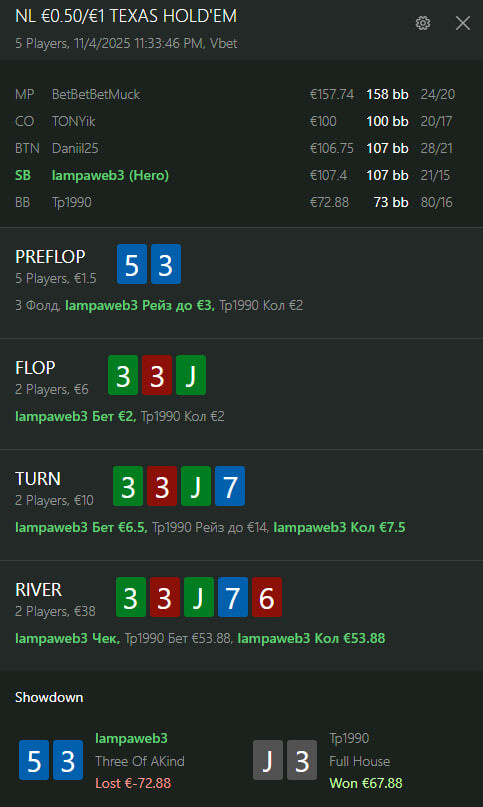 Точно не пам'ятаю як саме відбулась роздача але гравці по флопу виставились.Гравець під ніком Тернопіль міг перемогти але його переїхали.Мої ж J2o які викинув прифлоп сила що збирали натсовий стріт.