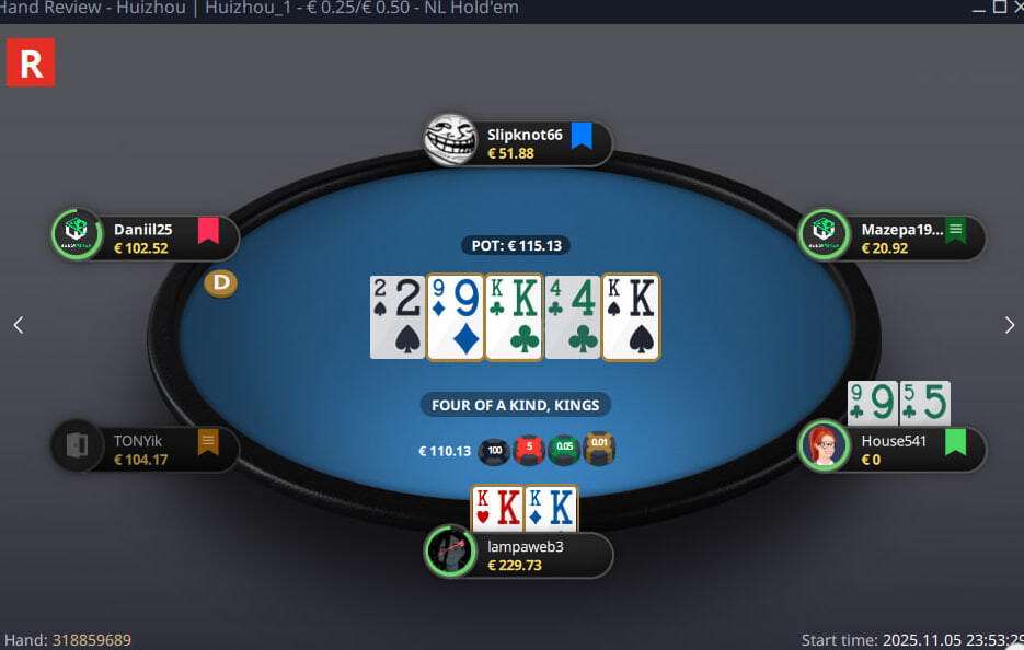 він закінчився в + і це вже непогано але чесно кажучи якось важко, майже усі грали обережно і прям відбитих гравців не побачила основний + зробила на префлоп виставленні КК > ДД тобто просто пощастило