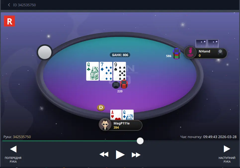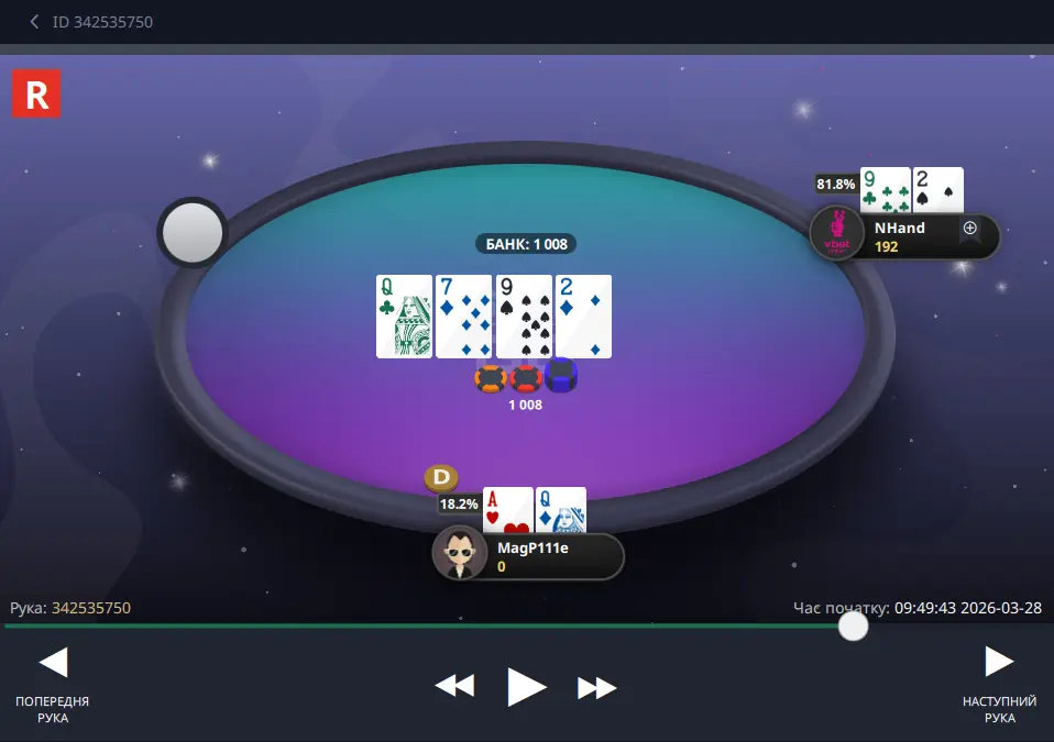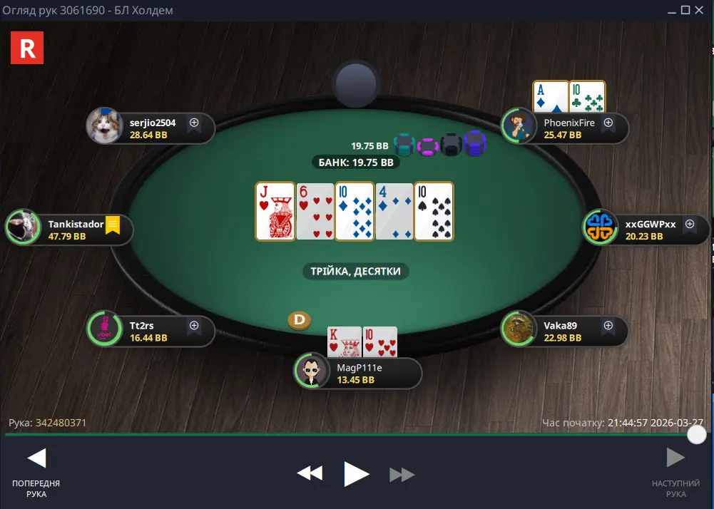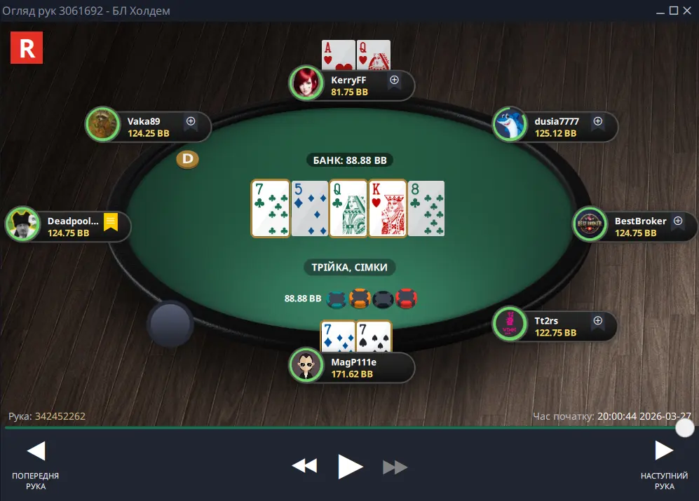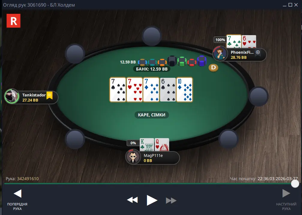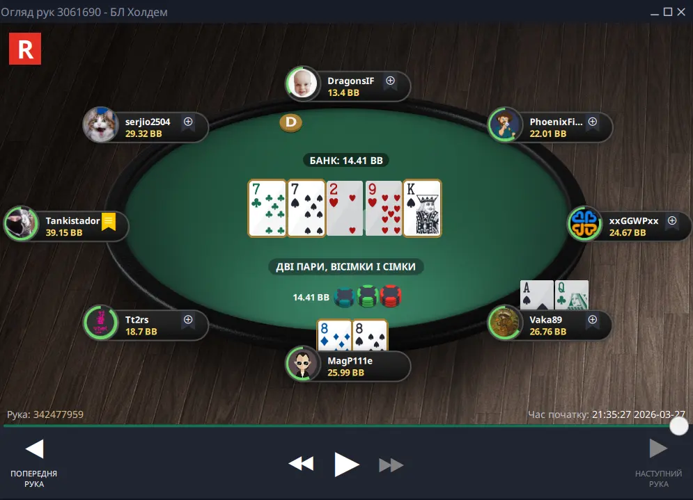 З перших роздач вдалося поцілити у гарний банк. Не пам'ятаю хто "відкрив" роздачу, я ж заколив свої 7️⃣7️⃣, гравець на малому також кол. В мене сет, але блайнд донкає велику на флопі, вирішив просто поколити. Тьорном вже був чек від опонента, то я вирішую добирати великою – там кол. Рівер мене відверто злякав і на чек я «чекбекаю» (Можливо, більш профітно було добирати більше на тому ж флопі рейзом + знайти якусь невелику ставку рівера, але як вже зіграно).