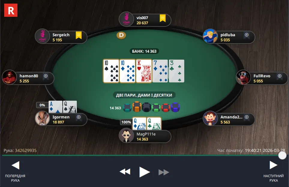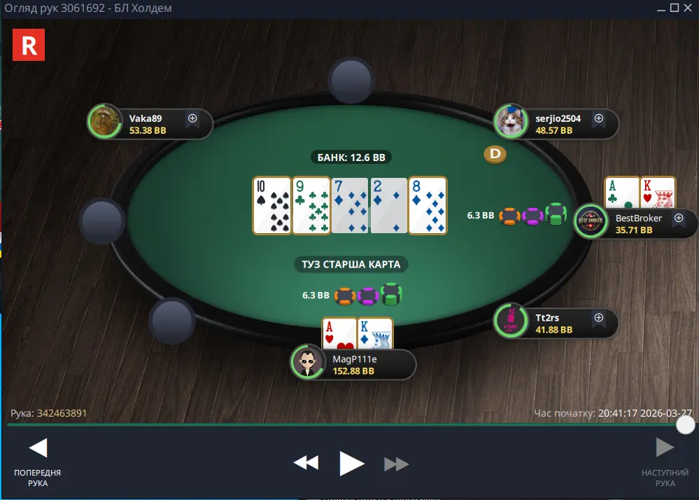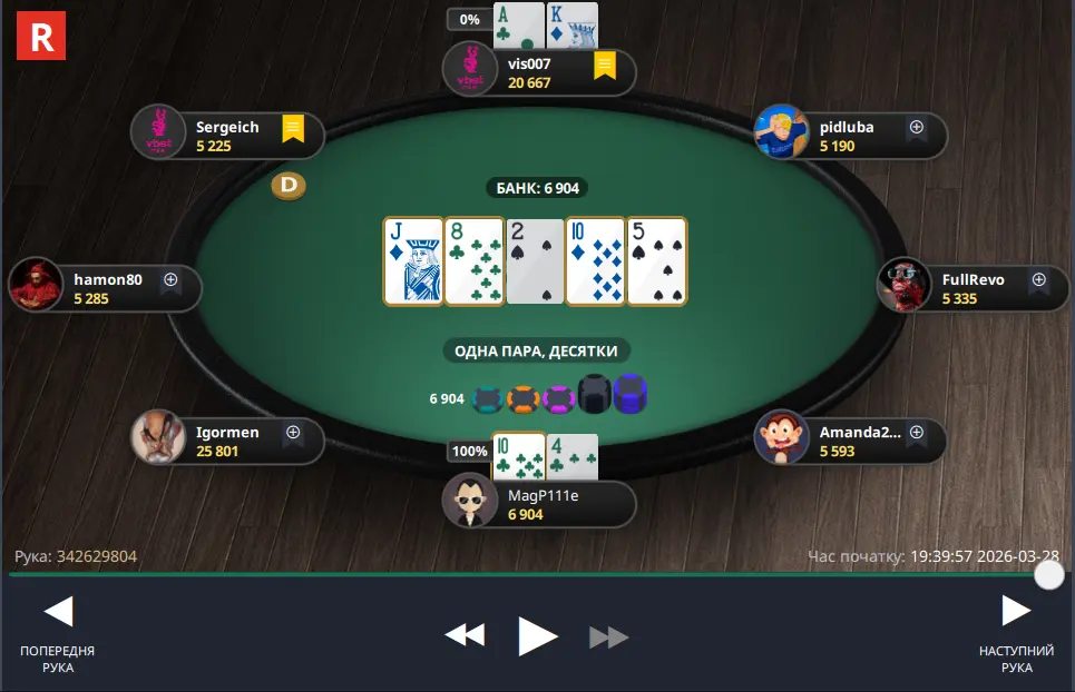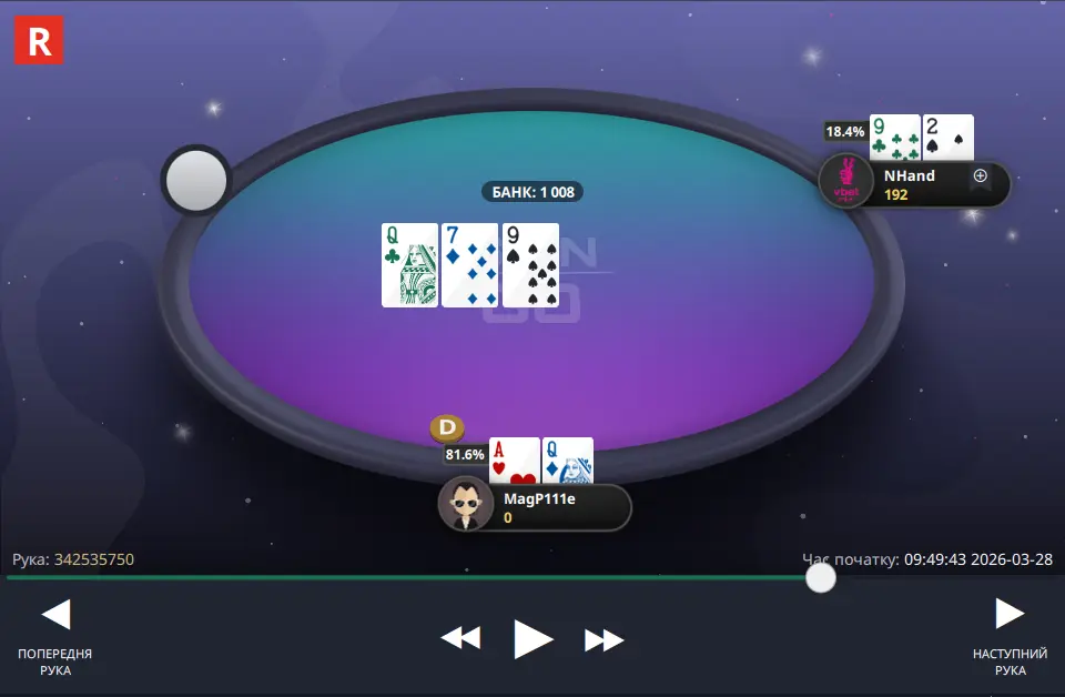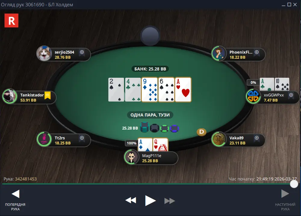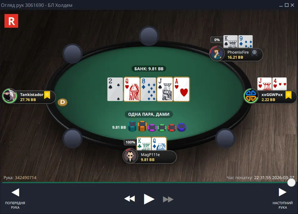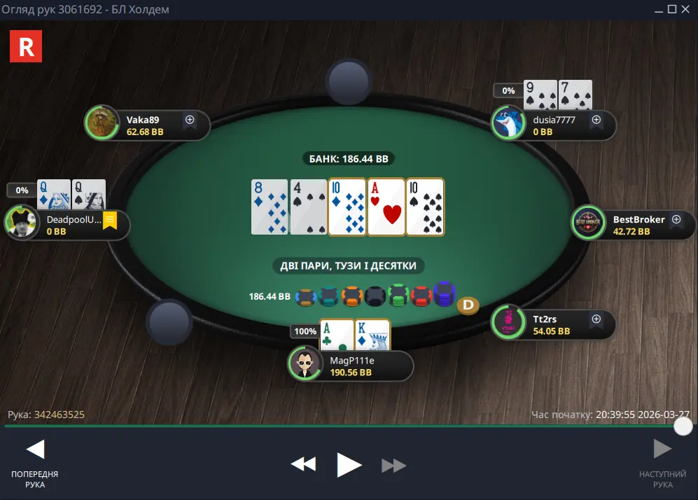 З перших роздач вдалося поцілити у гарний банк. Не пам'ятаю хто "відкрив" роздачу, я ж заколив свої 7️⃣7️⃣, гравець на малому також кол. В мене сет, але блайнд донкає велику на флопі, вирішив просто поколити. Тьорном вже був чек від опонента, то я вирішую добирати великою – там кол. Рівер мене відверто злякав і на чек я «чекбекаю» (Можливо, більш профітно було добирати більше на тому ж флопі рейзом + знайти якусь невелику ставку рівера, але як вже зіграно).