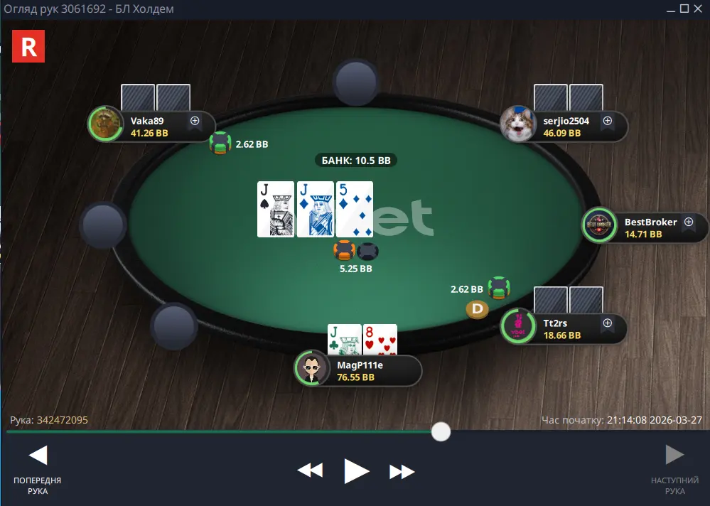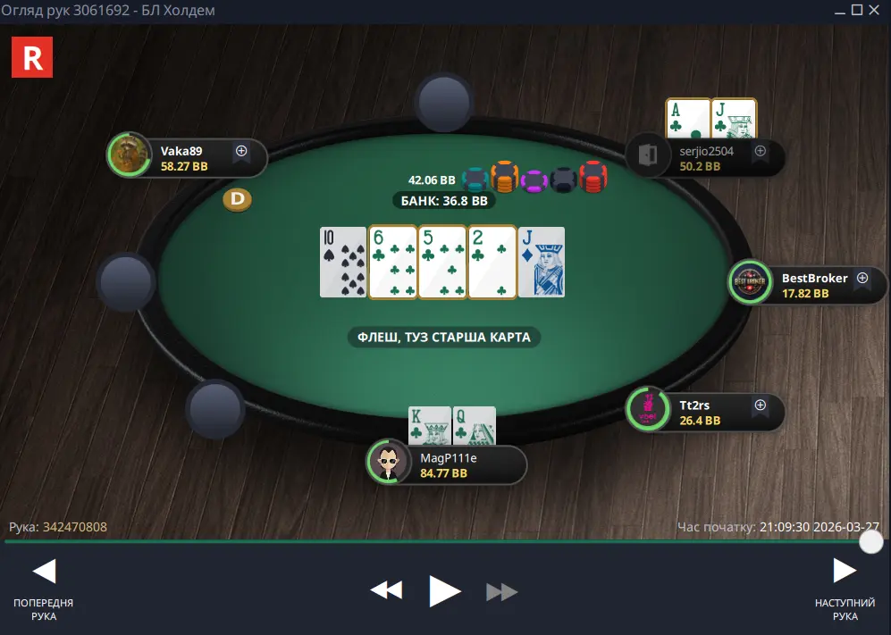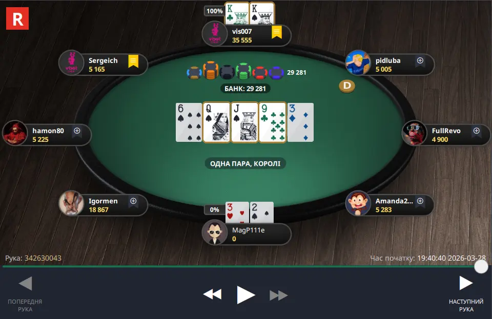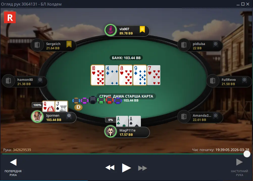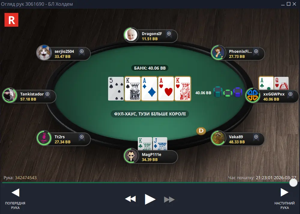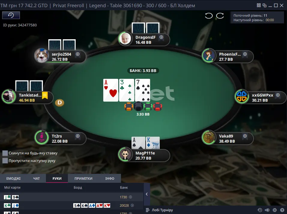 З перших роздач вдалося поцілити у гарний банк. Не пам'ятаю хто "відкрив" роздачу, я ж заколив свої 7️⃣7️⃣, гравець на малому також кол. В мене сет, але блайнд донкає велику на флопі, вирішив просто поколити. Тьорном вже був чек від опонента, то я вирішую добирати великою – там кол. Рівер мене відверто злякав і на чек я «чекбекаю» (Можливо, більш профітно було добирати більше на тому ж флопі рейзом + знайти якусь невелику ставку рівера, але як вже зіграно).