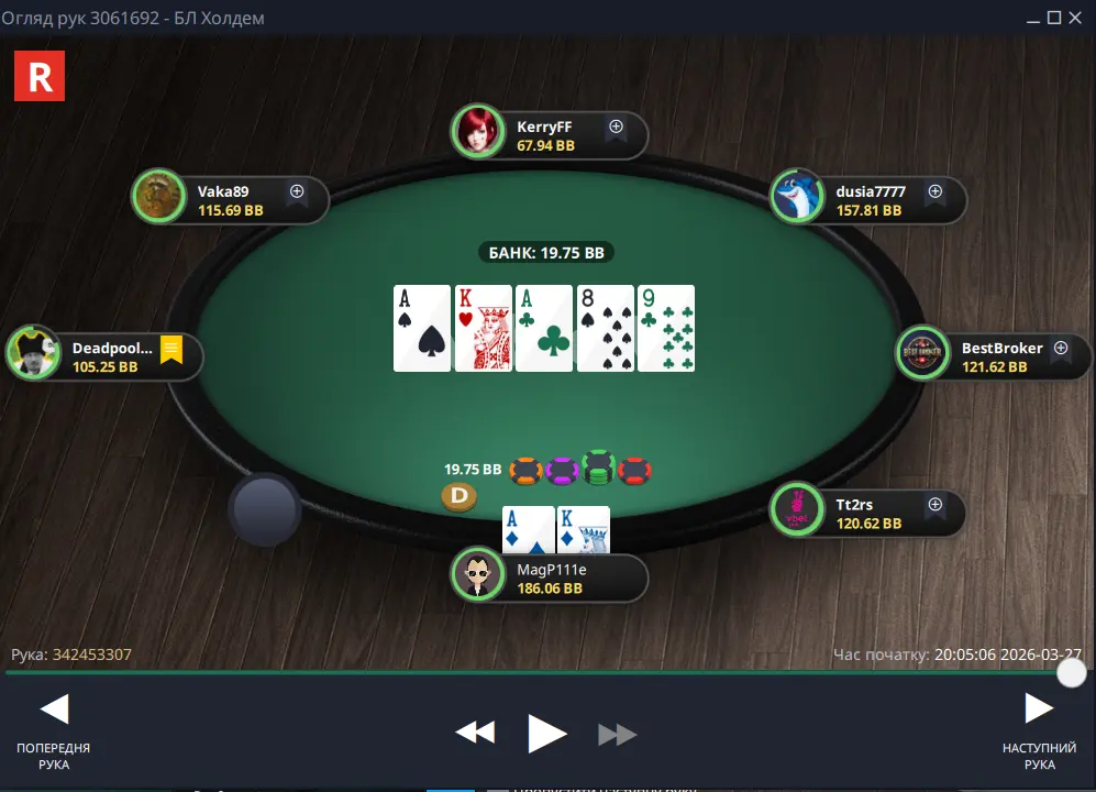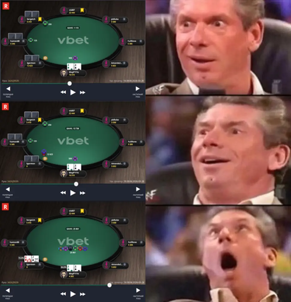 Турнір починаєтьзя з найгіршого можливого сценарію для мене – лише 2 гравці окрім мене і 5 ситаутів за столом. Я ледь не молився богові, що б усі ці люди позаходили. Звичайно ж починається клятий 3макс з купою мертвих грошей. І, в цей самий час, спортсмен ліворуч вирішує, що йому даром не здався той постфлоп і він просто буде репушити по 100бобів. Так ще й робити це настільки майстерно – він «задоджив» наче клята фантомка (Хто зрозумів – той зрозумів😅) кожні мої АК (Яких за цей час встигло промайнути 6-7 штук) і тд, але варто було мені відкрити якісь Т9о чи щось такого так одразу «розпишися і лови репуш». Так тривало 40 хвилин (А Ви маєте розуміти, що у такому форматі це не ті самі 40 хвилин за фулрінг столом – я нарахував 100 роздач, далі реплеєр просто відмовляється провантажувати), замість мого стільчика вже лишалися лічені тліючі вугольки.