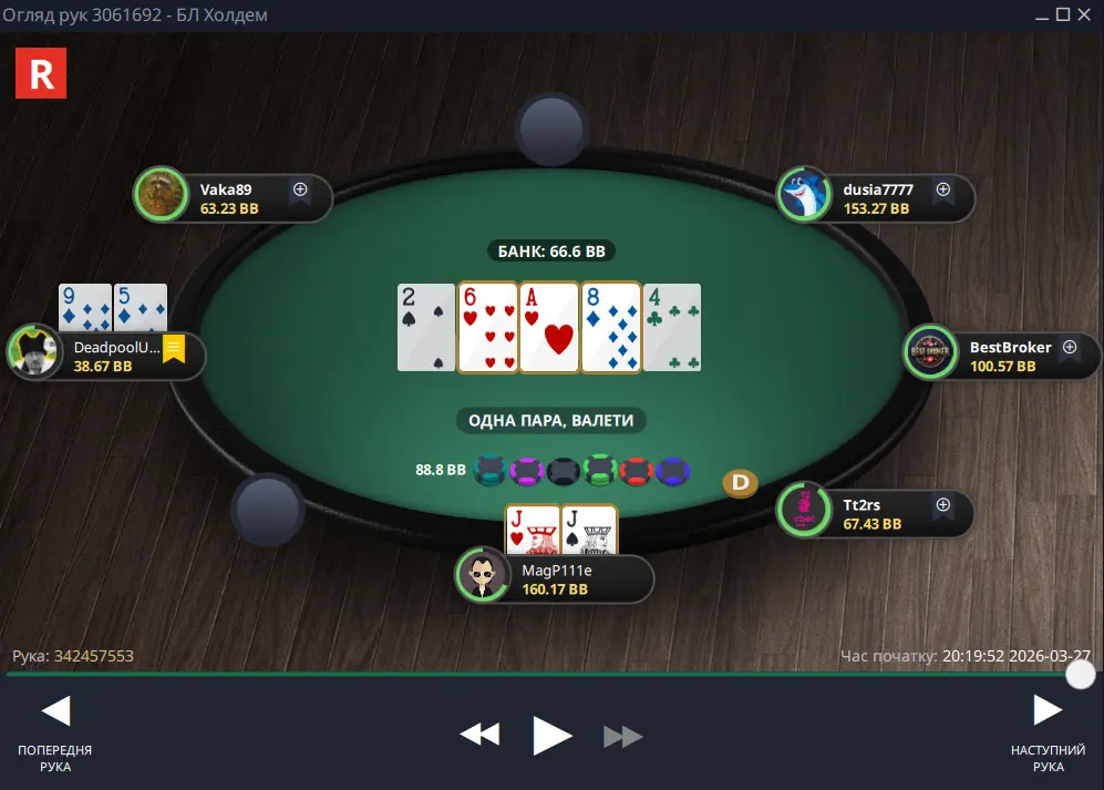 Ну і ось така роздачка «на десерт». Опен пуш від dusia~19вб, я ще місклікнув і просто дав «клікача» х2 замість репушу і Deadpool задумався – я вже побіліти встиг🥶🥶, бо подумав що він натисне кол і буду вимушений грати без позиції такий до непристойності величезний банк. Але ні, репуш і я з радістю натискаю кол і віддаю ситуацію на волю долі, фортуні та усім кому тільки можна (Все, чому я навчився за 4+ роки в покері, але то таке🤡). Встояли!