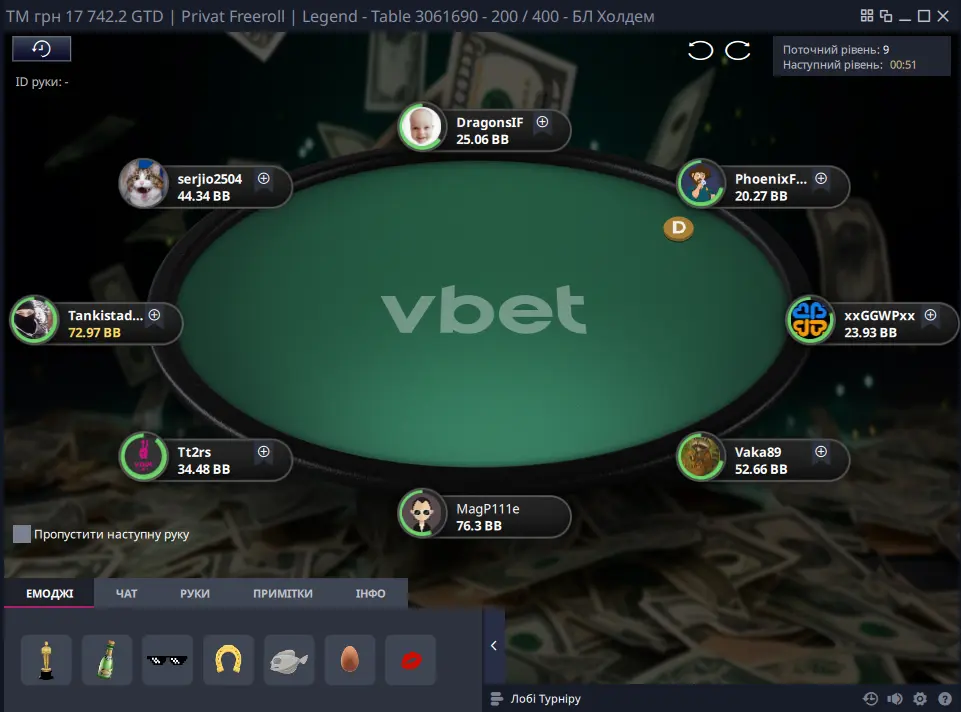 То ж надалі мені залишиться лише виживати. Тут не захотів репушити Vaka, бо не помічав, що б він занадто зловживав відкриттями – вирішив спробувати побачити флоп і це мені вдалося.