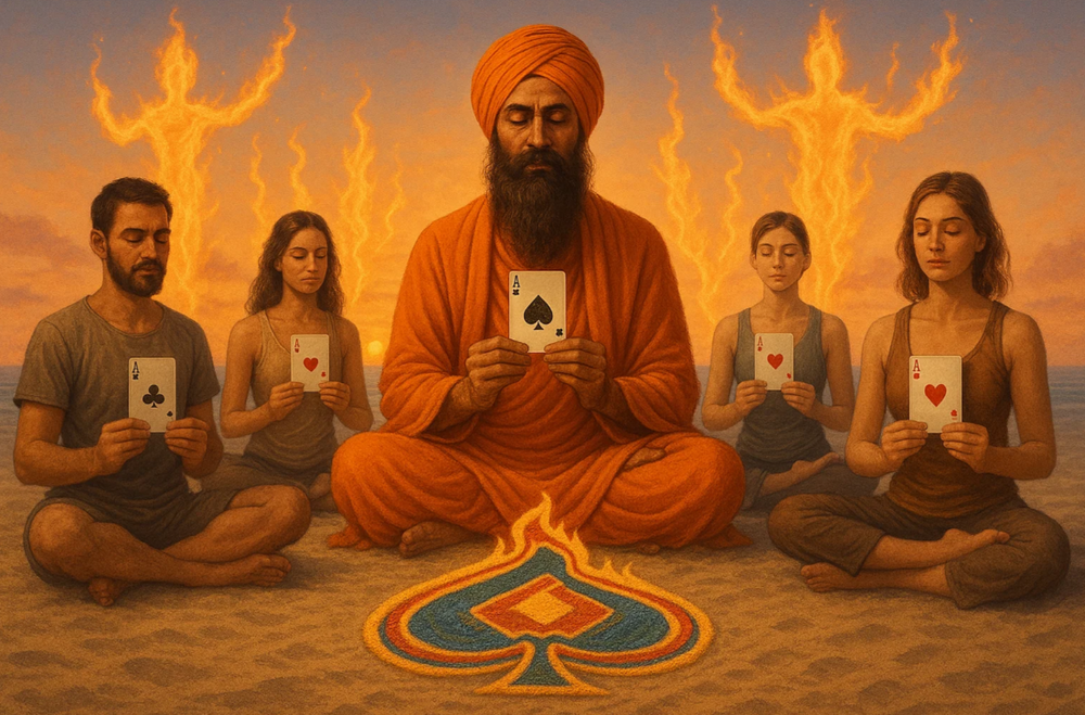 Ранок зустрів у таборі Гуру. Тиша, дим пахощів, карти розкладені як мандала. Один старий з білою бородою, якого всі знали як MaysterSlova сказав мені: "Кожен туз, що приходить до тебе, - це дзеркало твоїх страхів". Ми медитували в позі лотоса, тримаючи в руках по карті. На світанку вони зробили вогняну інсталяцію у формі флеша. Це виглядало як диво.
