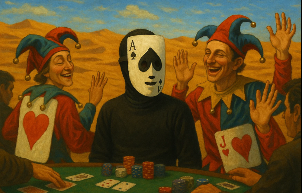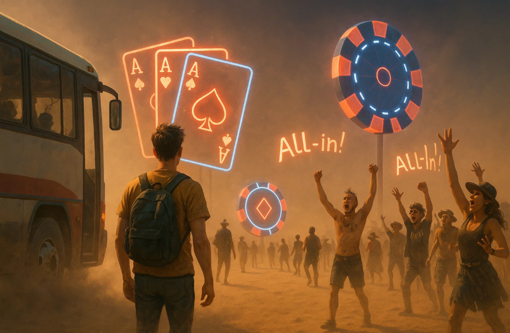 Я вийшов з автобуса, і мене накрила хвиля пилу та музики. Але тут не було звичних скульптур, натомість у центрі пустелі сяяли неонові карти, а фішки діаметром у два метри крутилися, як вітряки. Люди зустрічали мене з криком "All-in!" замість "Привіт". Я зрозумів - це буде інший світ.