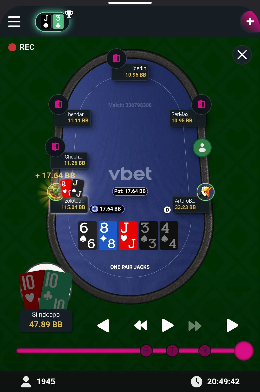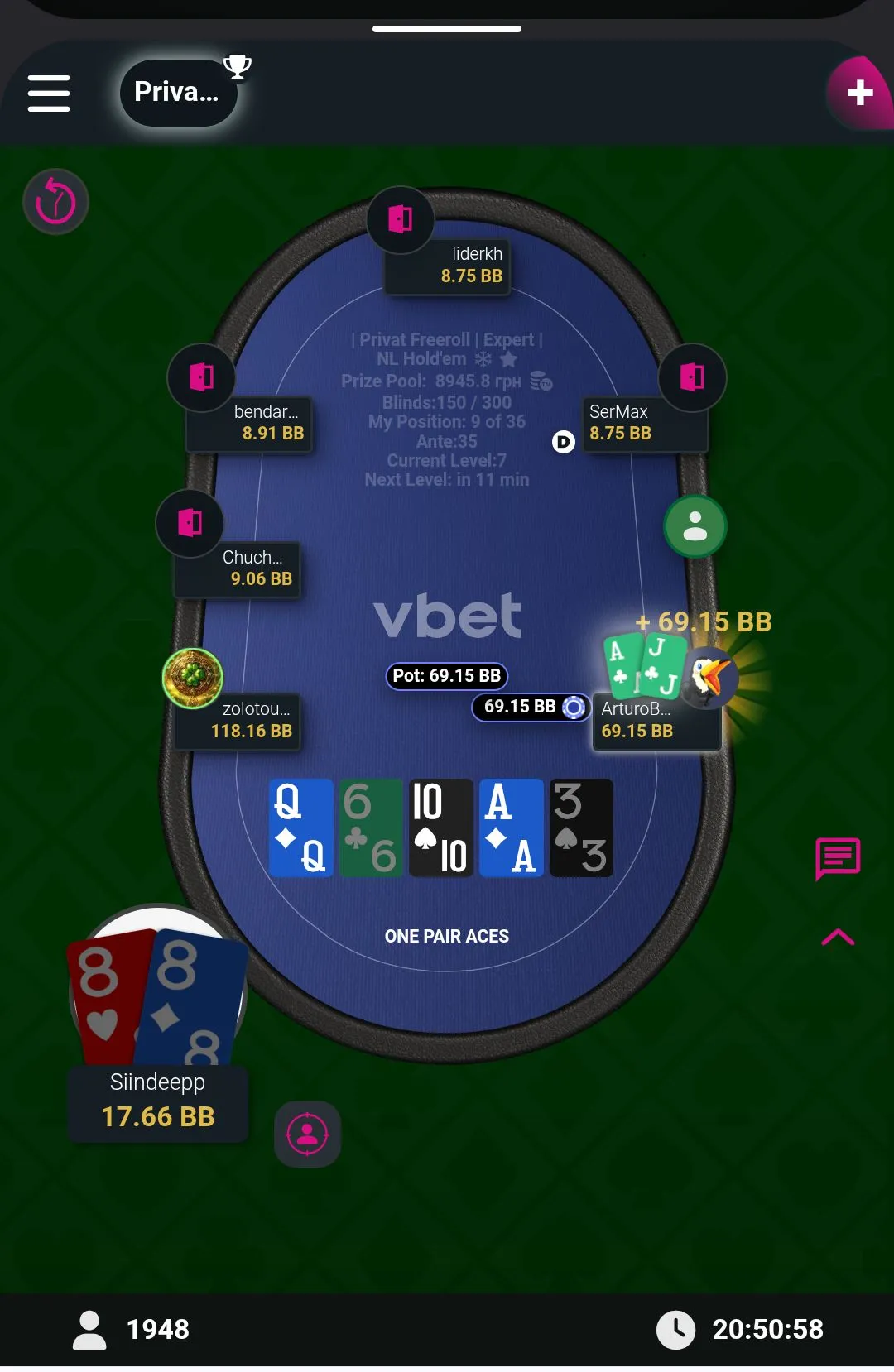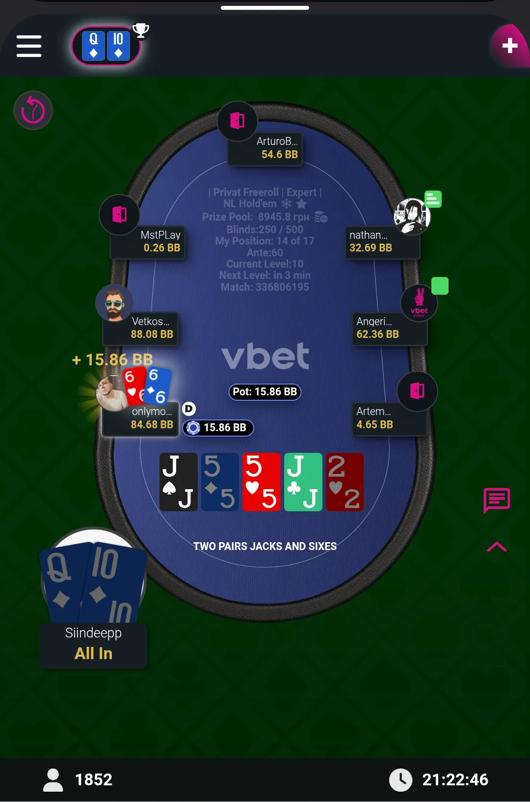 Ну і на останок турнір від Вісника. В цьому мтт була цікава фішка. Після вильоту , до закінчення пізньої реєстрації, можна було зробити 2 безкоштовні входи. Тож в першій роздачі, коли я відкрився рейзом в 2 бб, гравець зробив 3бет у 8 бб, після чого третій гравець пішов ва-банк , четвертий теж ол ін, я вирішив заколити з В10 одномасними. В результаті перша роздача турніру, де 4 гравці виставились, моя!!