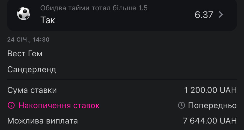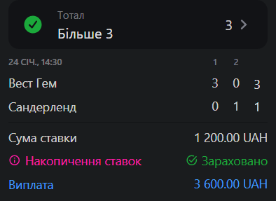 Вже після 1-го тайму ця ставка не могла програти і разом за дві ставки вийшло +1200, що досить непогано😎