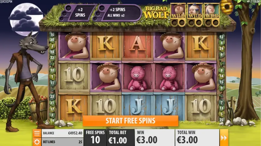 Big Bad Wolf – це ігровий автомат від Quickspin за мотивами відомої казки про вовка та трьох поросят. Його популярність обумовлена не тільки сеттингом, але й дуже високим RTP. Також тут є і бонусний раунд з безкоштовними обертами.