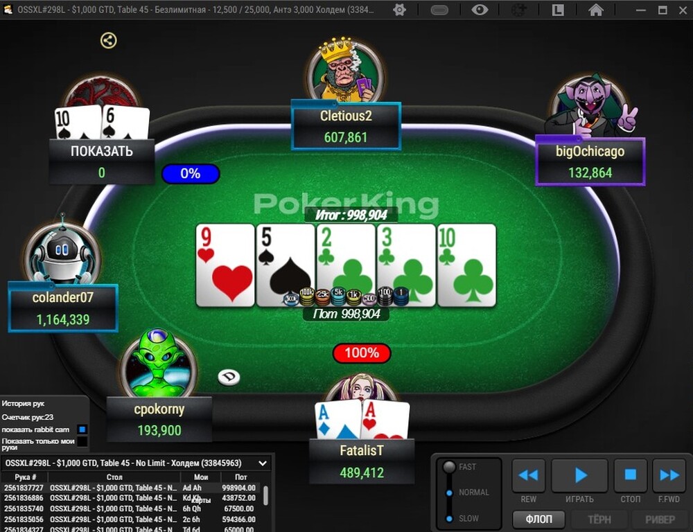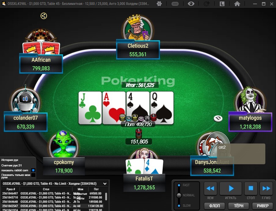 Допер з флопа! Хитро посміхаюсь та нагрібаю побільше фішок "в руку", зі сподіваннями, що там знову АА чи КК, ставлю. Опонент кол!