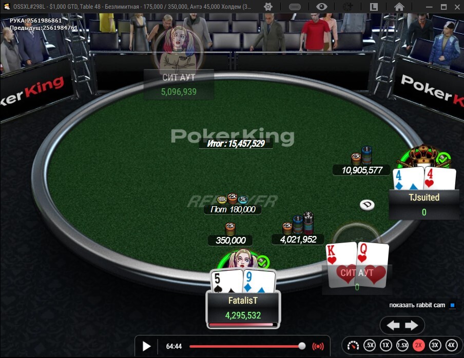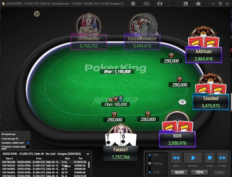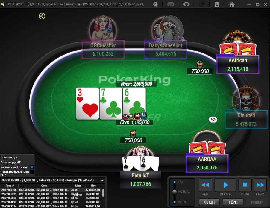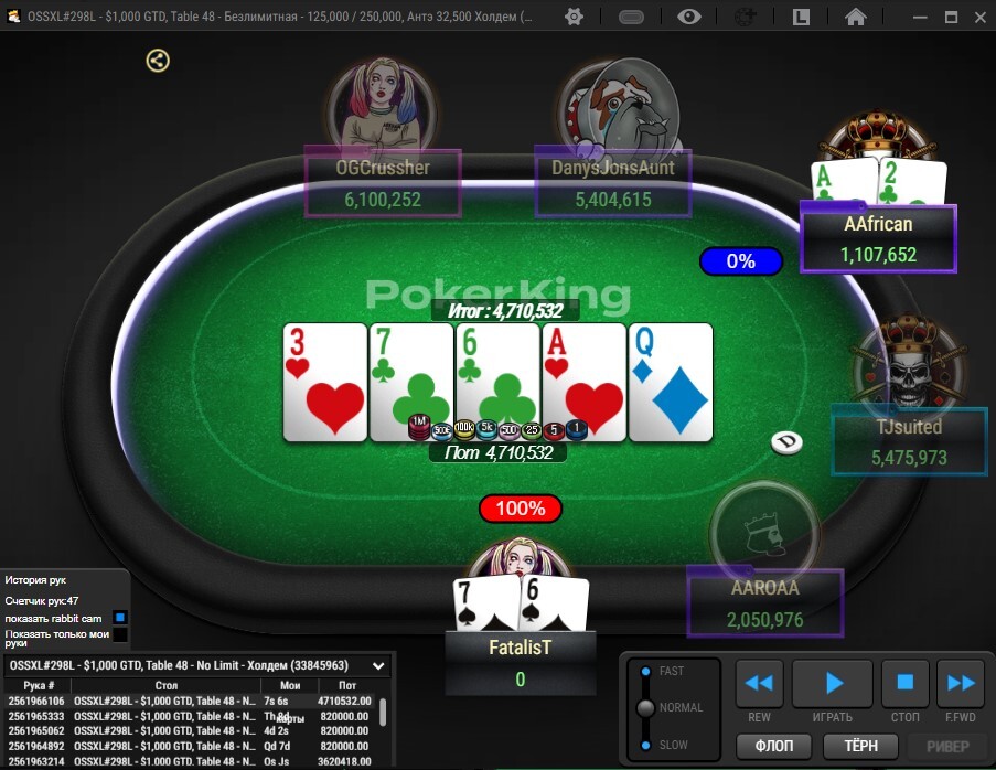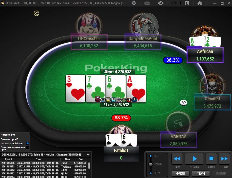 Найсильніший гравець з тих хто залишився - чіплідер TJsuited, OGCrussher - активний фартовий любитель, а AAROAA - щось середнє між любителем та регуляром.