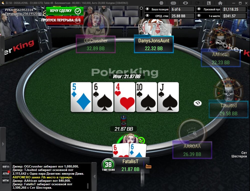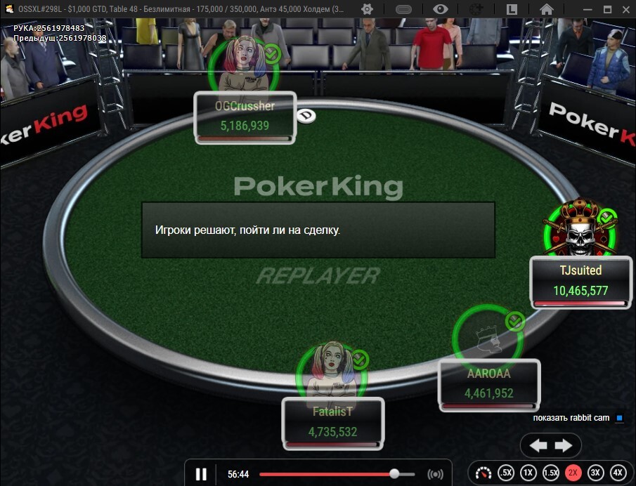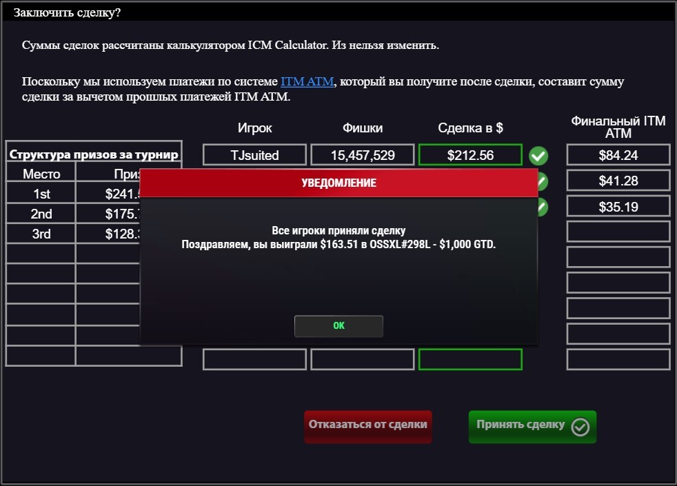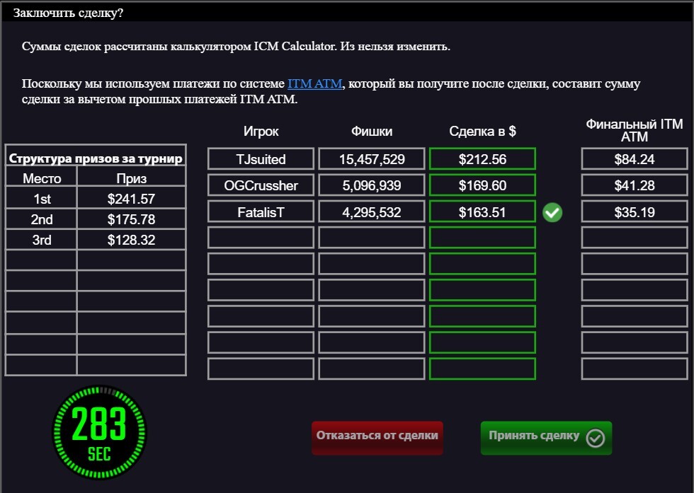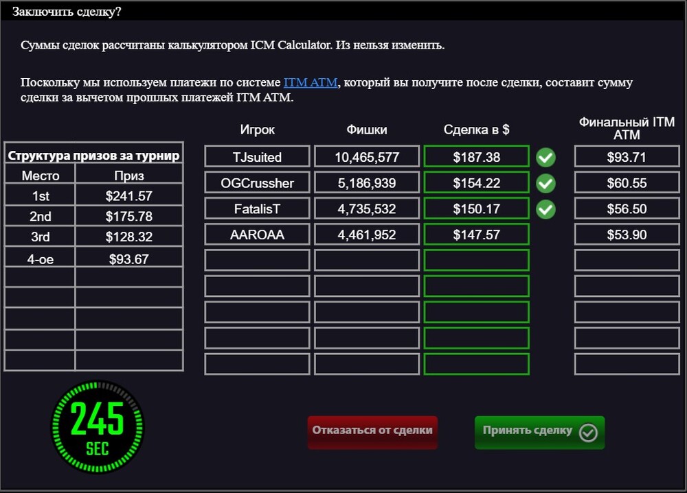 Я моментально погоджуюсь, як і OGCrussher. А ось TJsuited думає. І його можна зрозуміти. Він має перевагу по фішкам більш як в 3 рази, та змогу тиснути на нас через близькість наших стеків. Також він явно сильніше грає за гравця на 2-му місці. При цьому грошей пропонують далеко не в 3 рази більше і навіть не у 2 і не в 1,5...