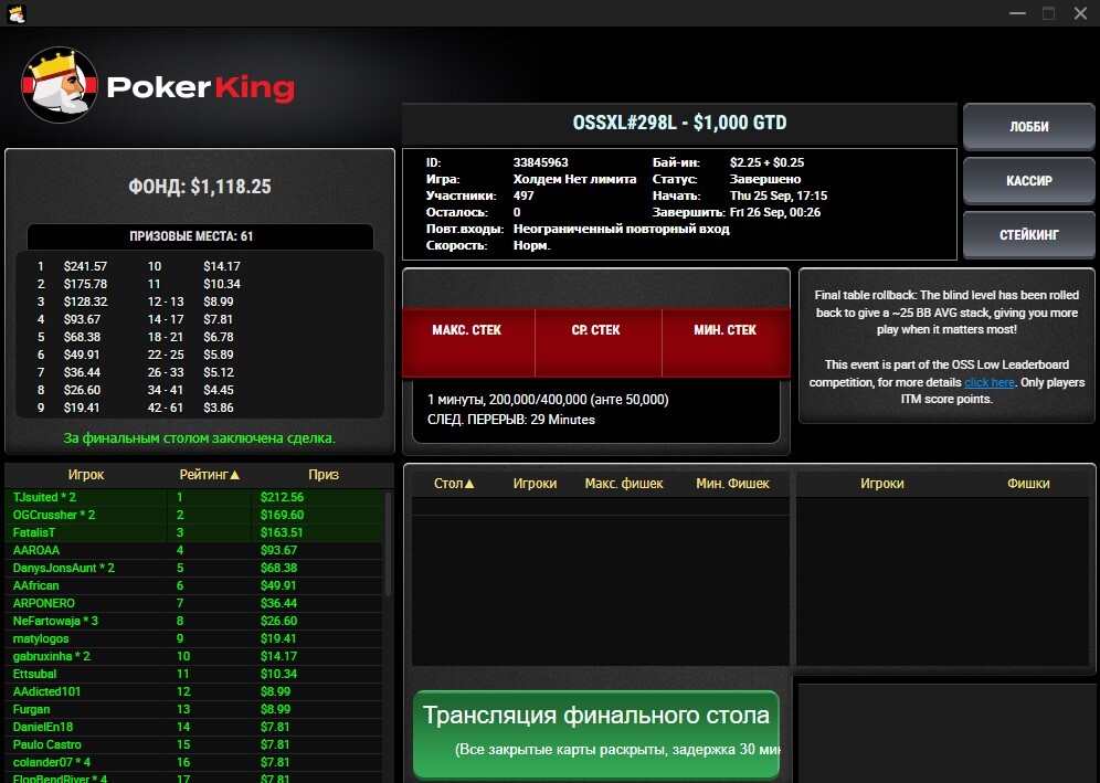 Оскільки в «хомках» у мене «гольова засуха», то я вирішив поділитись з вами розповіддю про успішний для мене турнір, який я зіграв кілька тижнів тому. Все почалось з того, що неочікувано мені прийшов лист на пошту з інформацією про те, що у румі PokerKing, в якому я не грав вже багато років, мені було нараховано 10T$. Зрадівши такому подарунку я зайшов у рум, обрав для себе турнір за 2,5$ і зареєструвався.