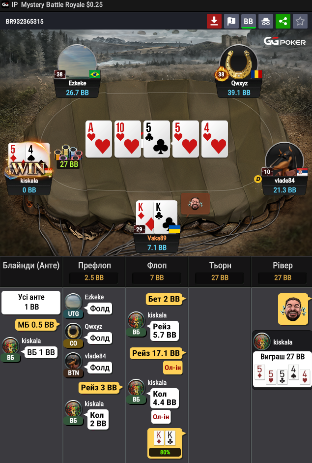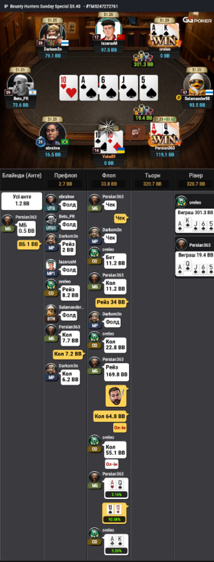 Буквально годину тому відлетів в Bounty Hunters Special за 10,8 на GG. Турнір гарно йшов, набив 15 баксів ноками ще до ІТМ, і ось залишається вже 100 людей до призів (поляна на секундочку 2,5к входів). Іду собі спокійно з середнім стеком (40 бб). Спот БвБ, я на малому проти бразила на великому, в мене А3s. Я лімп, він ізол, я чогось накрутив себе, стата в нього агресивна, прописую 3бет, він кол. Дошка К-хай, пішов виблефовувати щось, в у чувака просто були АА😁. При чому він зіграв прям добре, кол 3бета з АА БвБ це прям оптимальна гра, а я зіграв як макака)) Не знаю що на мене найшло, зазвичай так не роблю, буду уважніше слідкувати за своєю внутрішньою макакою😆