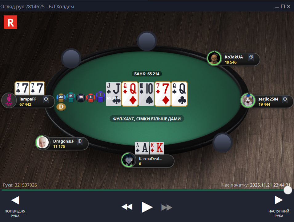 Нажаль на Vbet не можна відкрити історію рук завершених турнірів (а взагалі то на вібеті навіть у діючому турнірі, коли пересаджують за інший стіл історія рук скидається і це часом бісить, але зараз не про це).