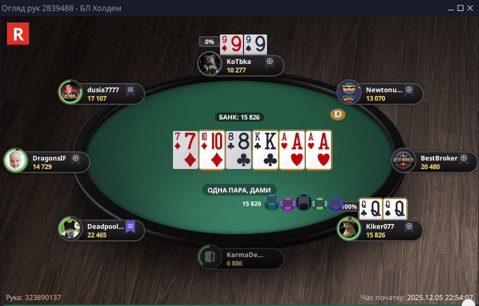 Тут не видно, але у мене АК були які полетіли в пас за мить до мого повернення. А ще оцініть якість реплеера на вібет, він персонально для мене вирішив викласти на борд додатковий туз, щоб мені було ще більш гірко, що АК скинулись. Після цього в когось ще залишилися сумніви, що в румах грають колодами, зарядженими в кіосках?)