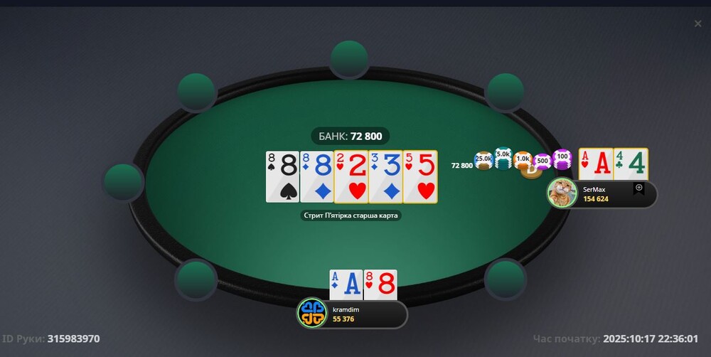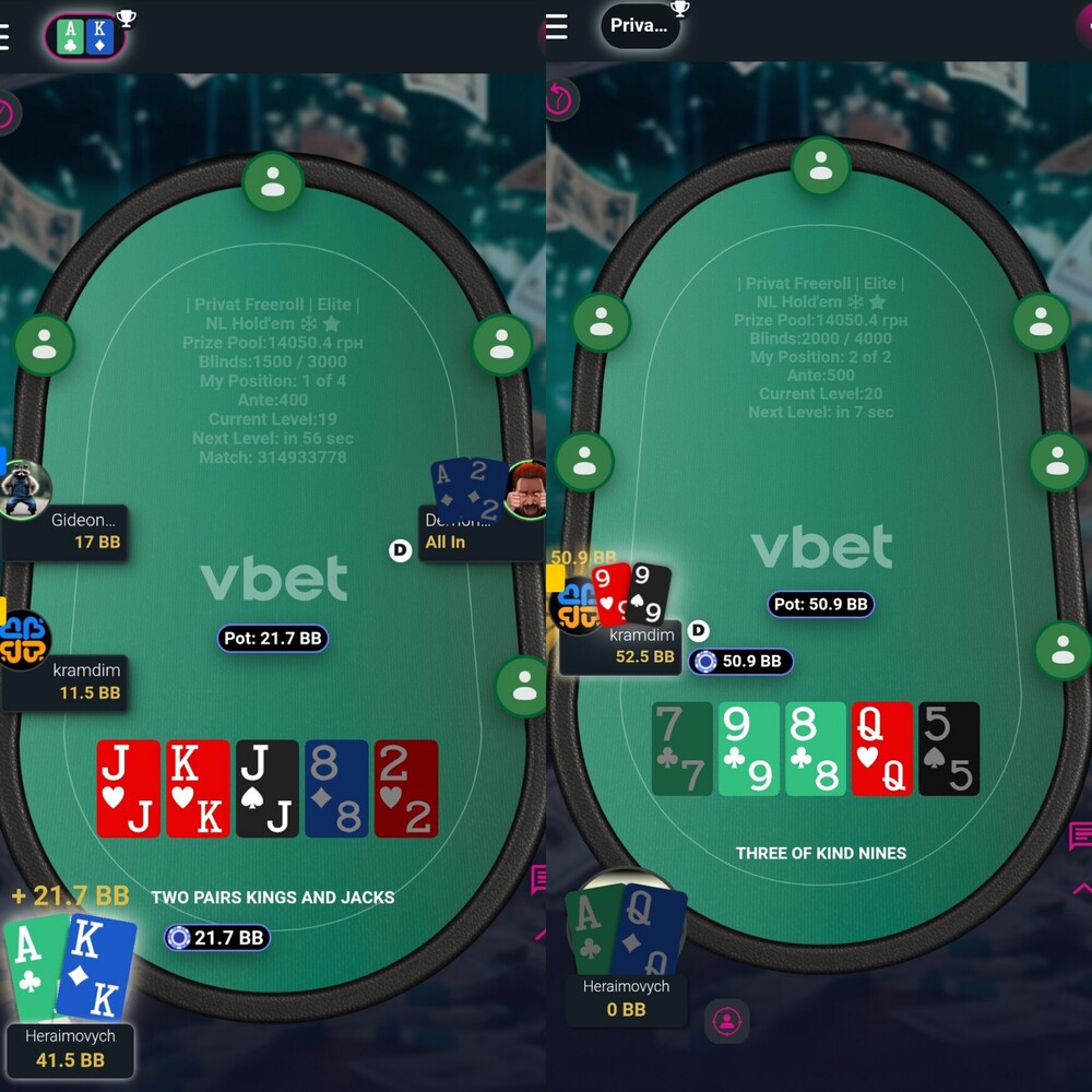 Топ-3. Цей відрізок турніру я розпочинав з найкоротшим стеком, але це не завадило мені все-таки вирвати перемогу. Спочатку Денис вибив Єнота, чим подарував мені перепустку до ХА.
