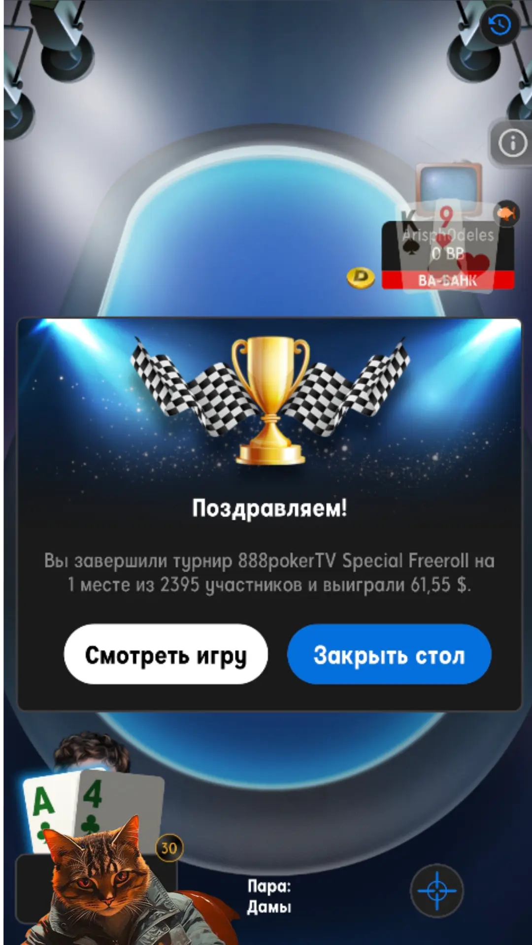 З 2395 игроків зайняти 1 місце,огоо)) мої вітання. 64 долларів з фріролу це гарний+ у банкролу. Мої вітання,так тримати в на далі!!!!))