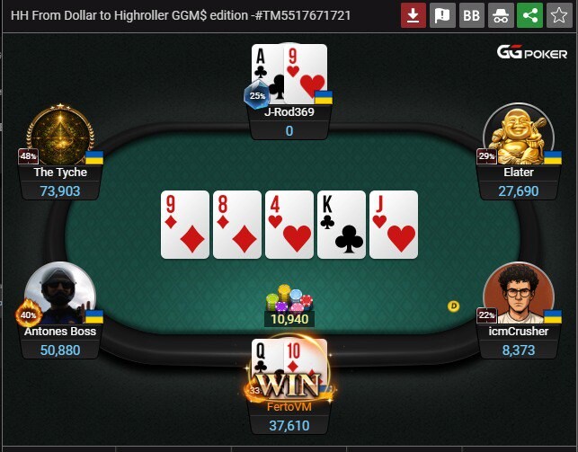Четверте фото: У якийсь момент турнір знову поставив перед вибором: чекати й повільно згасати чи ризикнути. Я обрав друге. Олл-ін — без зайвих прикрас і напіврішень. У такі моменти ти вже не рахуєш комбінаторику до останнього відсотка — ти відчуваєш, що час настав. І тут на столі з’являються два валети. У мене — стріт. Не просто виграш, а той самий момент, коли ризик виправдовується на сто відсотків. Фішки їдуть до мене, а разом із ними повертається впевненість. Саме заради таких роздач ми й граємо турніри.