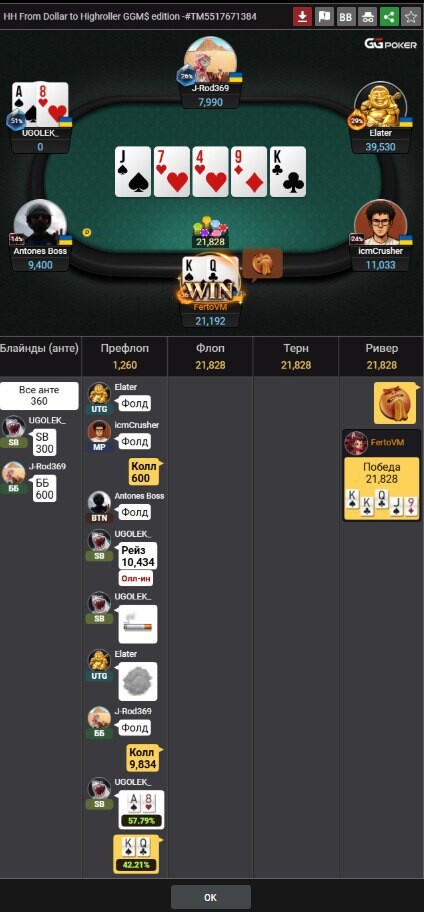 Фінал: Я розумів, що, найімовірніше, я стою проти пари. Це читалося по всьому — по таймінгу, по розміру стеків, по самому рішенню прийняти олл-ін. Але замість того щоб відступити й дочекатися кращого моменту, я зробив ставку не на математику — на удачу. Карти відкрилися. Борд не подарував жодного шансу. Нічого не прийшло. Далі було ще гірше, і я швидко програв то що в мене залишилося. Турнір закінчився різко й без компромісів — без призових, без можливості щось переграти.