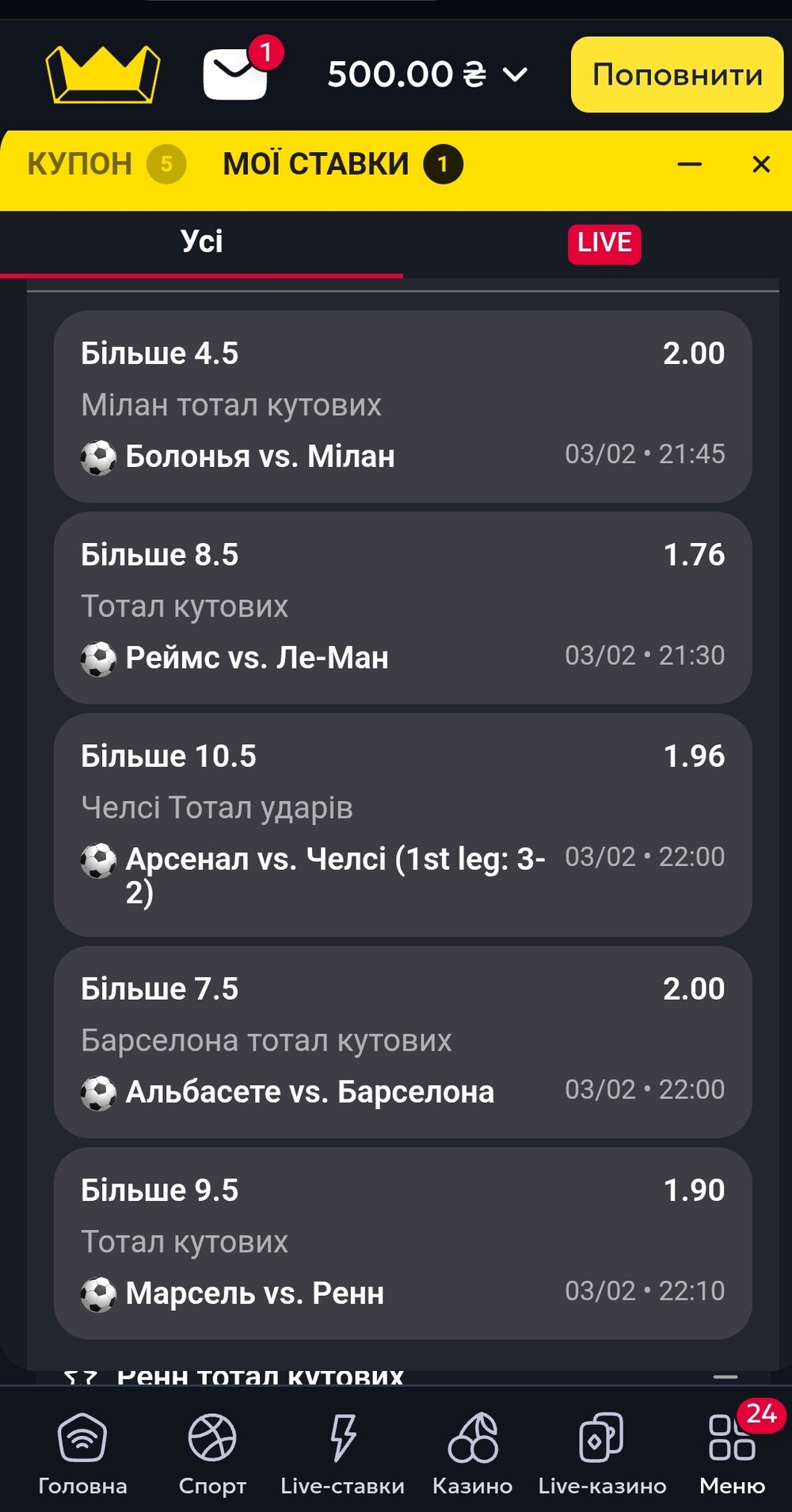 Замітив коли щось ставлю зі ставок на спорт то все грає проти мене напевно такий закон підлості існує 🙃Потрібно було хотя б по голови від роми і берн...