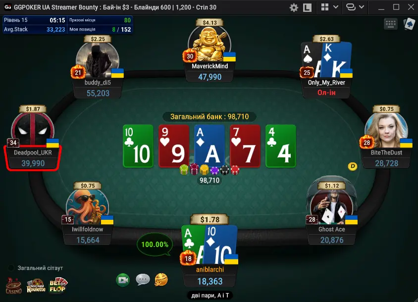 Третій тиждень був найбільш цікавим😄 На початку турніру набиваю собі фішки і пересажують до нас стрімера Psypokerrr. Докоряю собі трохи, адже мабуть треба було широко заходити проти стрімера, а я чомусь цього не робив🤷♂️