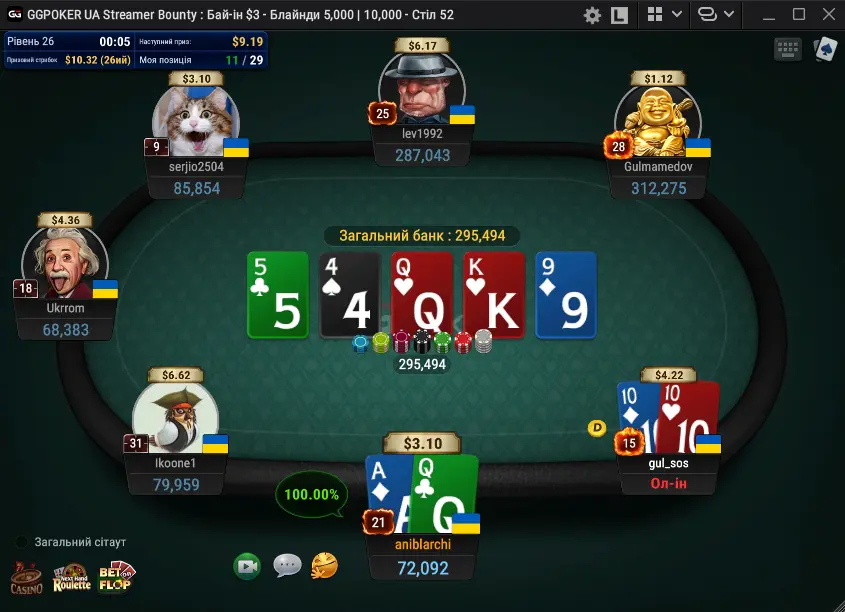 Далі виникла цікава ситуація: починаючий стрімер, який поки без "тегу стрімера" відкривається на катофі, я кол на великому блаінді. Флоп T9A веселка - я чек, опонент ставить третину поту, я ре-рейз 2/3 банку і він пихає в мене оленя😄