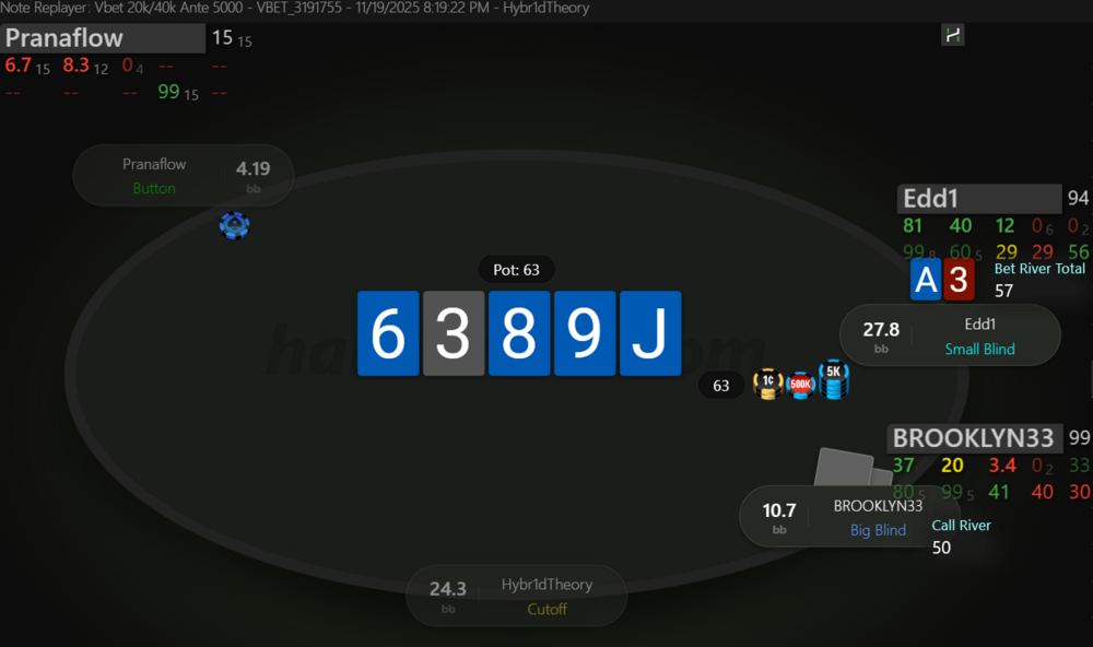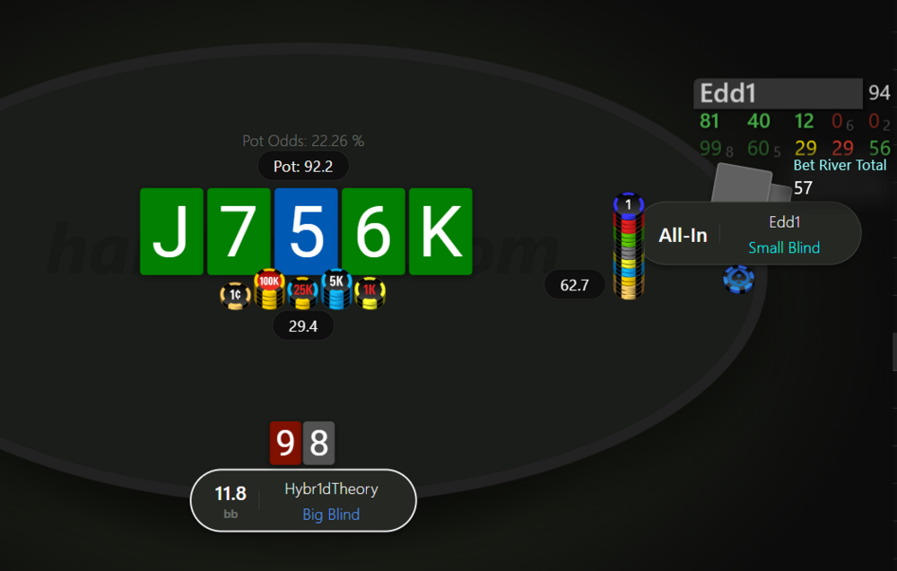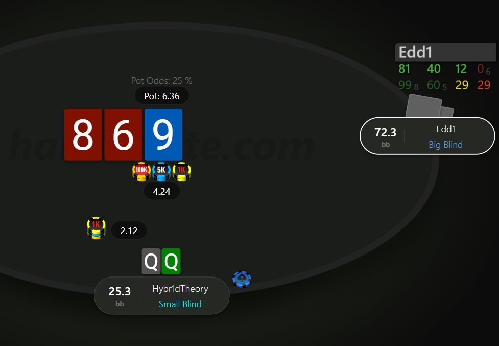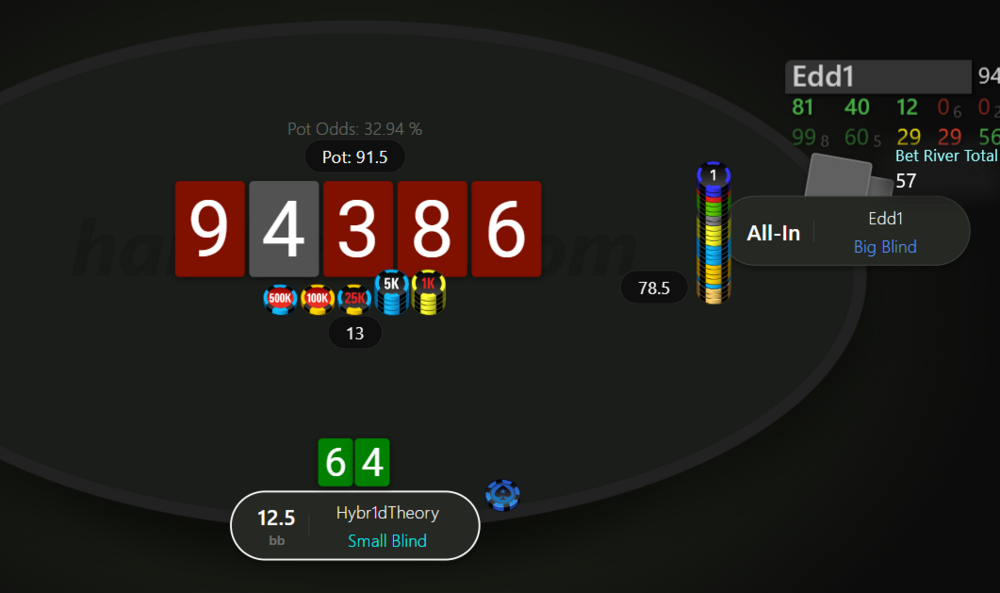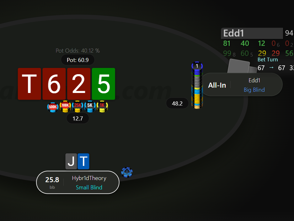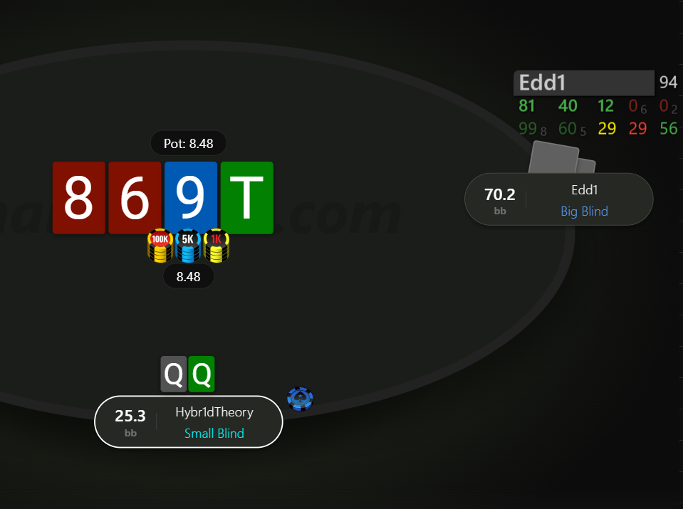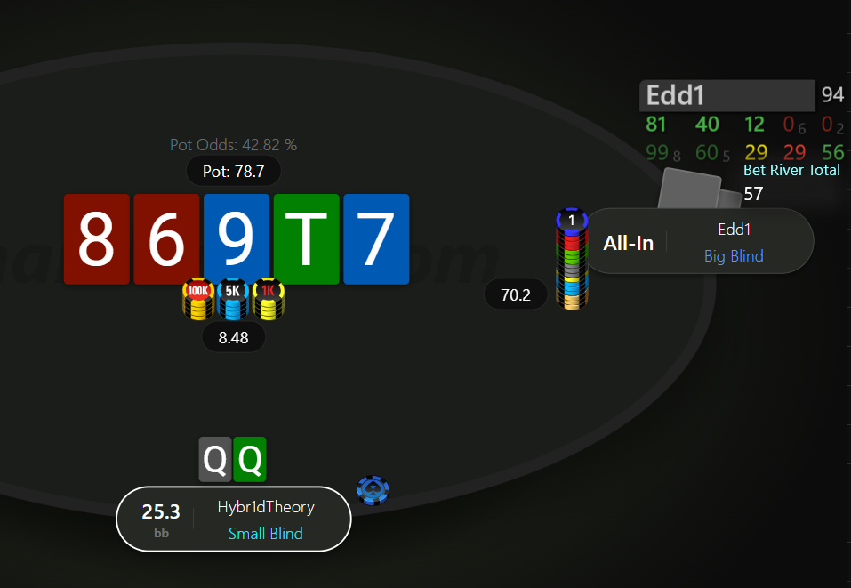 Невдовзі після подвоєння отримуємо 99 на МР. Пушити тут 99 - це ІСМ самогубство, бо чіплідер з ніком Edd1 прям дуже активно влітав за нокаути на будь чому, в той же час ми дуже сковуємо короткі стеки після нас, в них з'являється надія на наш виліт і заходити в роздачу зовсім не хочеться.