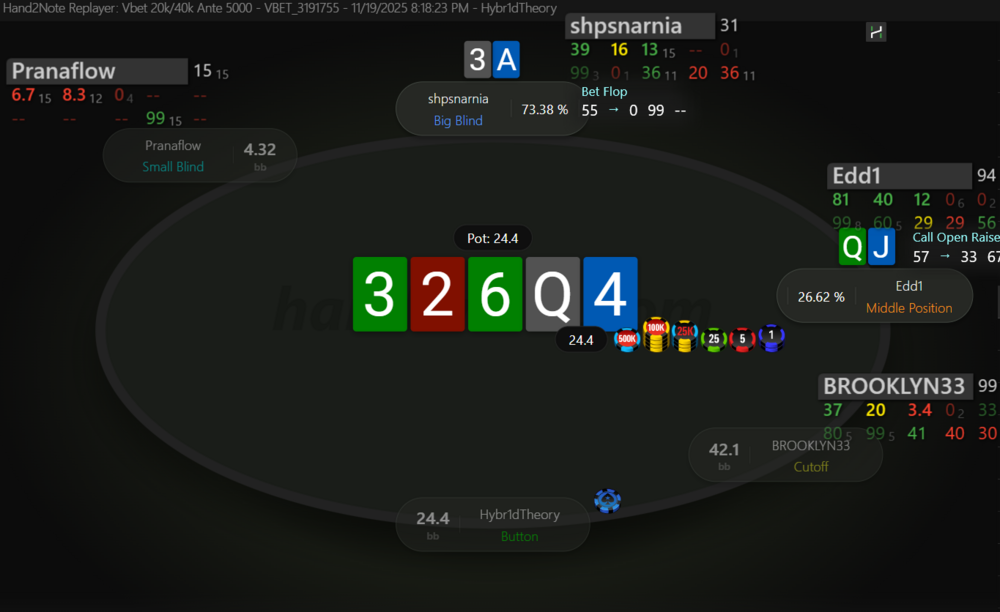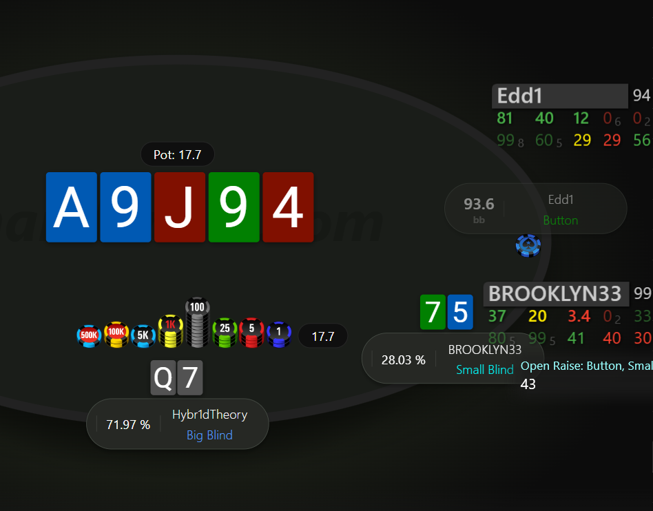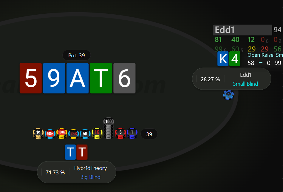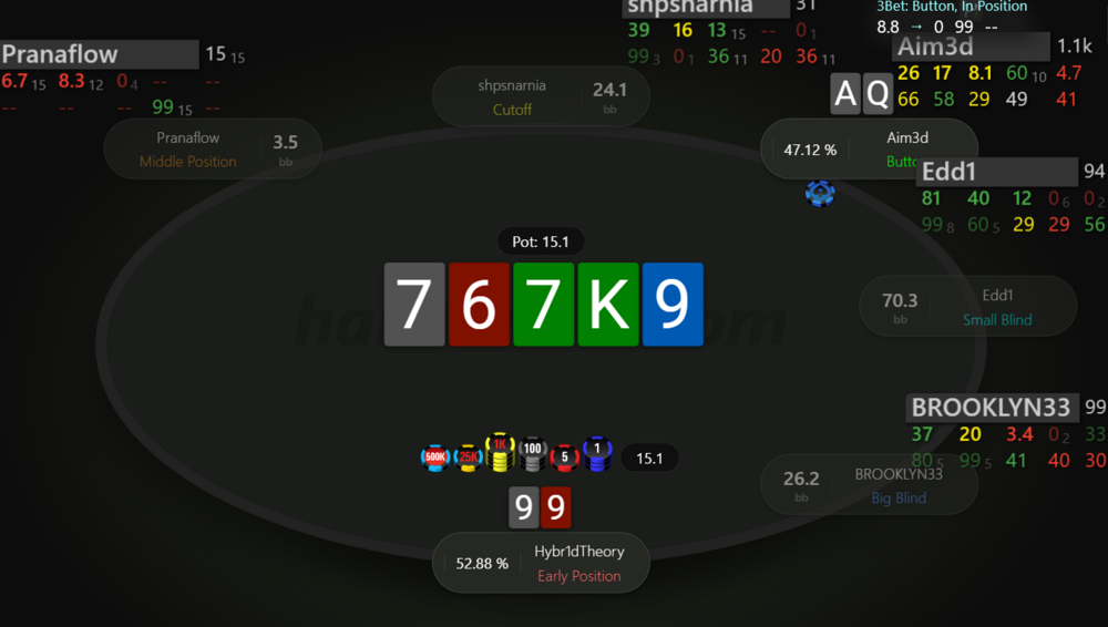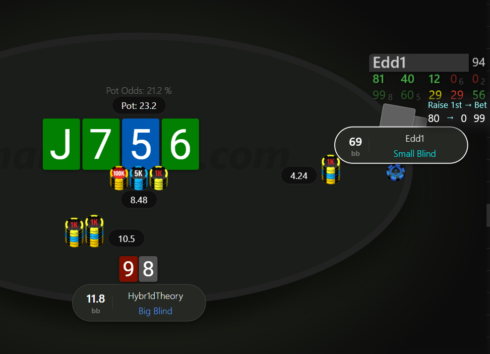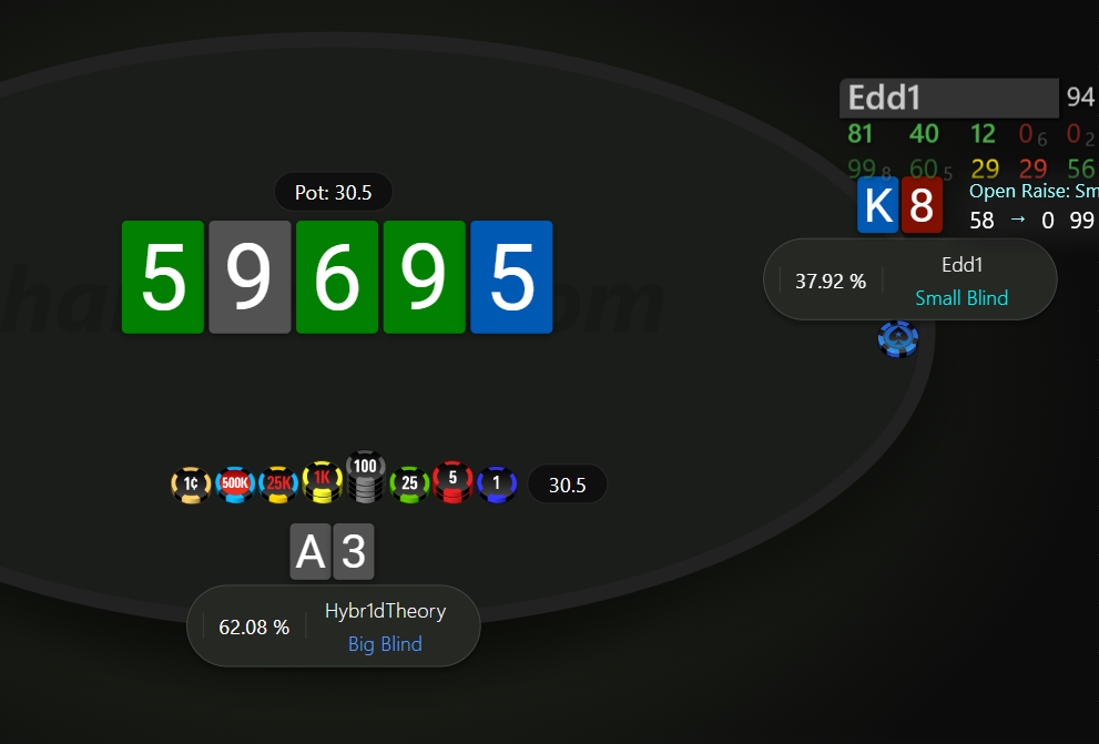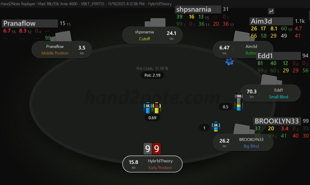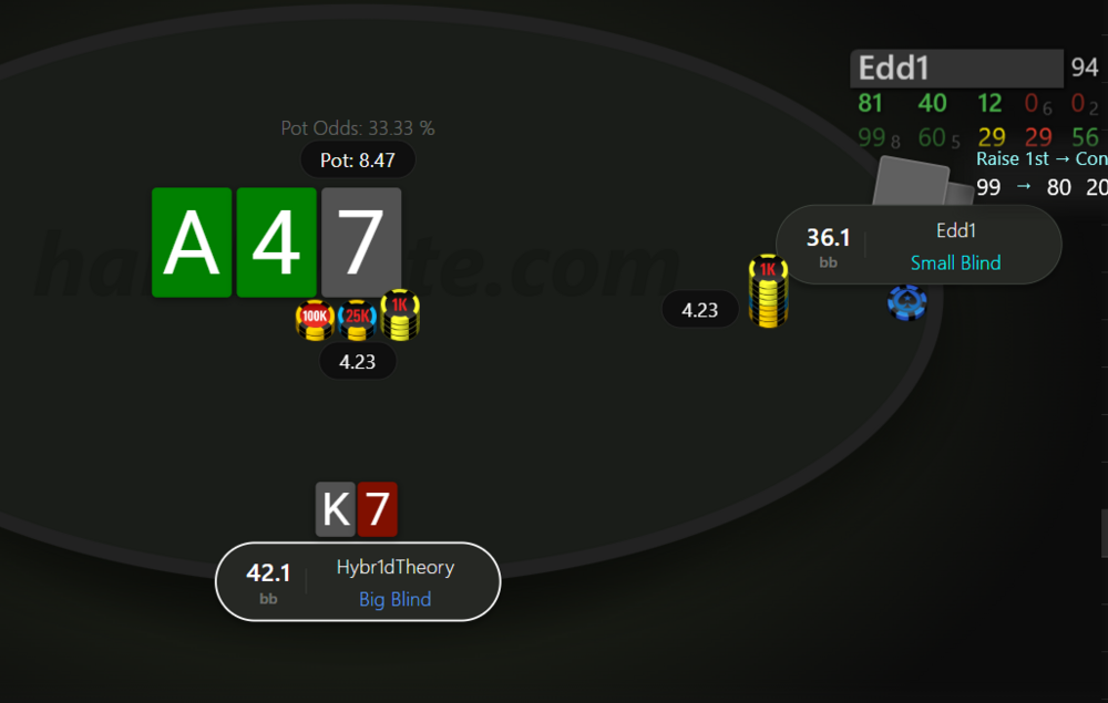 Невдовзі після подвоєння отримуємо 99 на МР. Пушити тут 99 - це ІСМ самогубство, бо чіплідер з ніком Edd1 прям дуже активно влітав за нокаути на будь чому, в той же час ми дуже сковуємо короткі стеки після нас, в них з'являється надія на наш виліт і заходити в роздачу зовсім не хочеться.