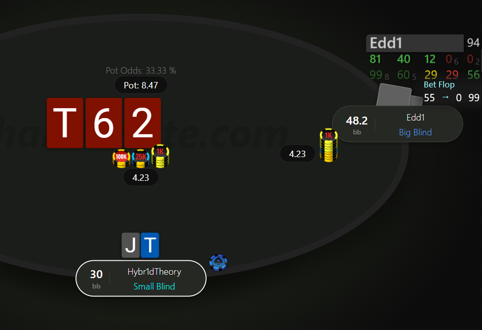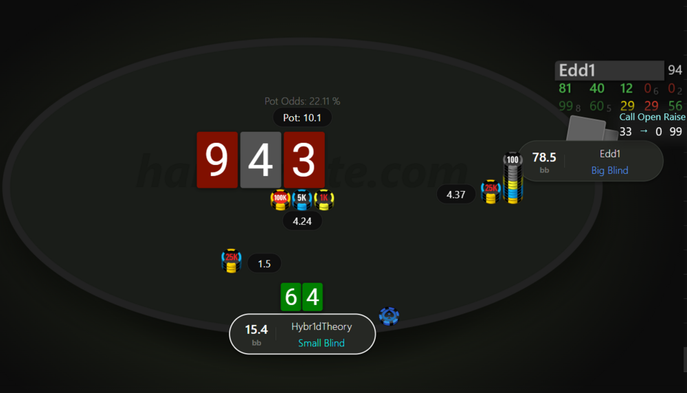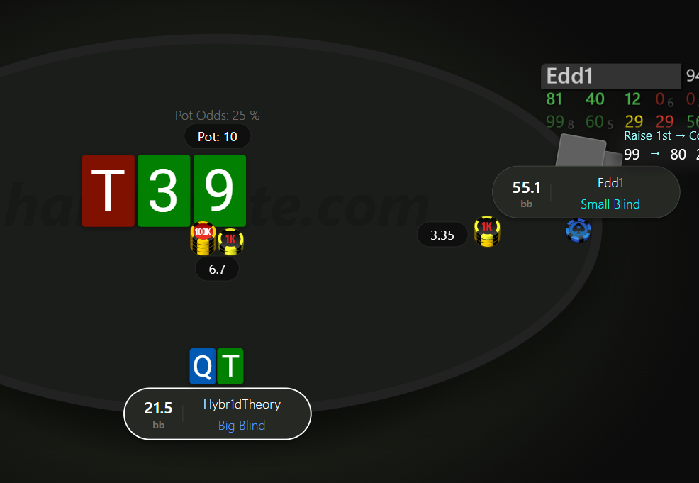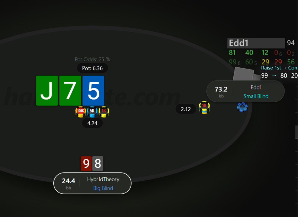 Префлоп Едді рейз 3 бб (він постійно використовував рандомні сайзи рейзу префлоп х3, х4, х4.5 і т.д.), я з 98о - кол. Флоп