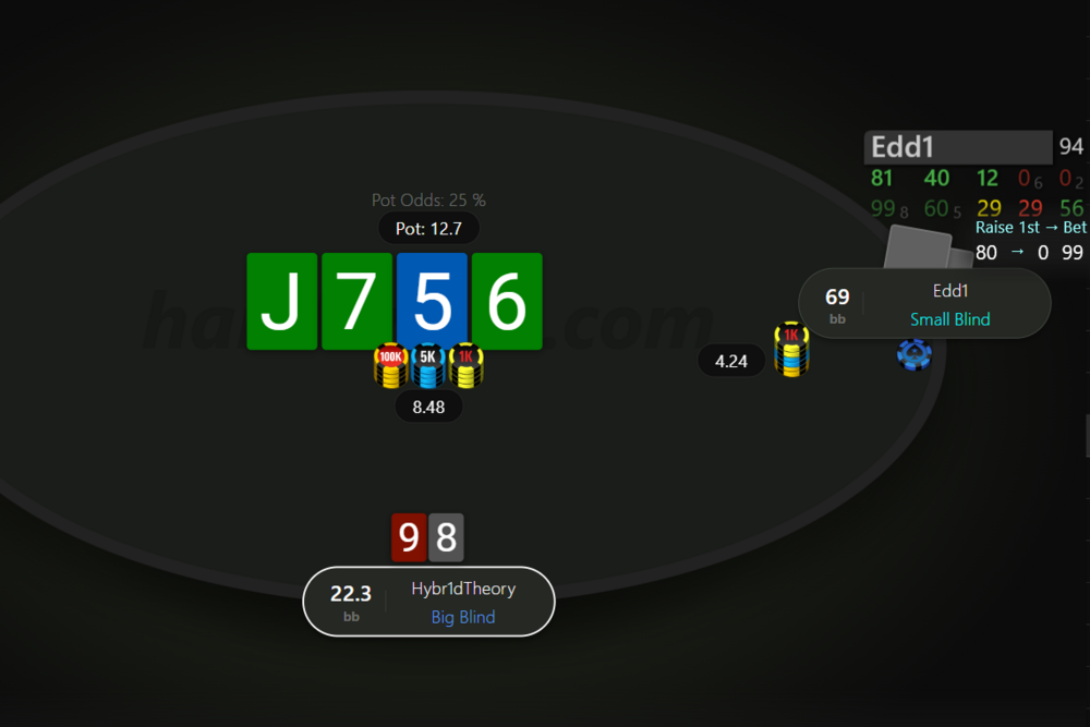 Гарний терн, не дивлячись на закрите ФД, у нас стріт. В хедзапі відсоток флешів від всього ренджу буде невеликий. Опонент знов ставить 1/2 пота, що мені здалося скоріше слабкою грою, тож вирішив чек-рейзити, про що потім пошкодував