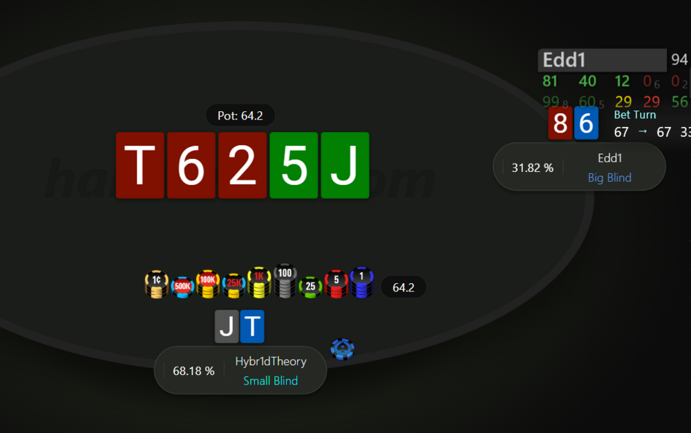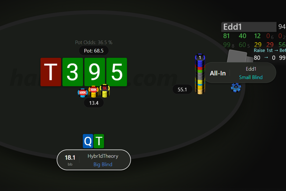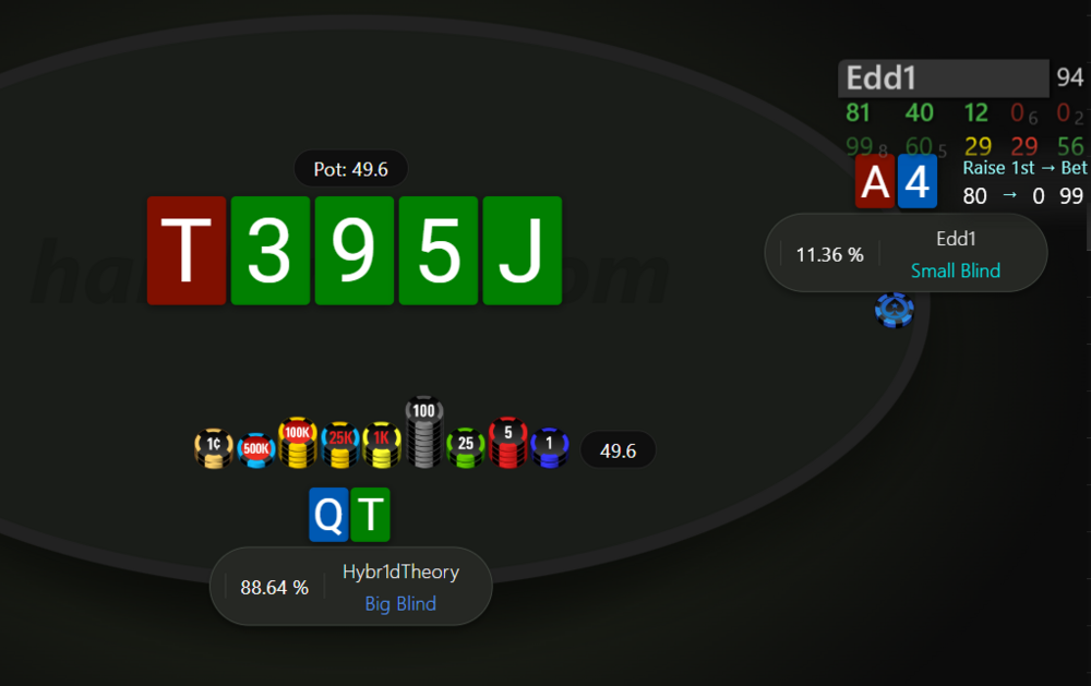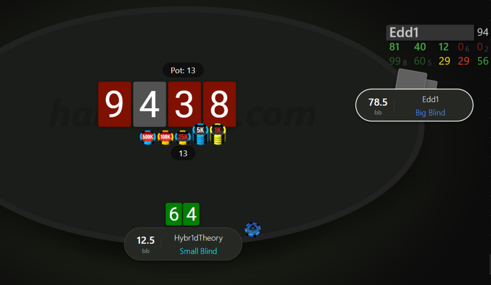 І ось тут почалось найцікавіше. Мотивації вистачало, сумарно наші нокаути складали щось близько 7к грн, при чому за мене нок був значно менший, а за Edd1 більше 5к🤑. Але його перевага у стеку 92 бб проти моїх 35 і до цього ж максимально агресивно-відбитий стиль гри залишали мені мало шансів. Але я дуже хотів перемогти, бо листопад для мене складається дуже погано, моментами мінус доходив до -500$, а на кінець вчорашнього дня він становив близько -300$. Ця перемога дала б мені трохи більше впевненості в своїй грі і вивела би місяць в невеличкий плюс. Хедзап тривав десь пів години, тому я виокремив декілька визначних роздач і розділив гру умовно на два етапи. Подробиці роздач будуть під спойлерами.