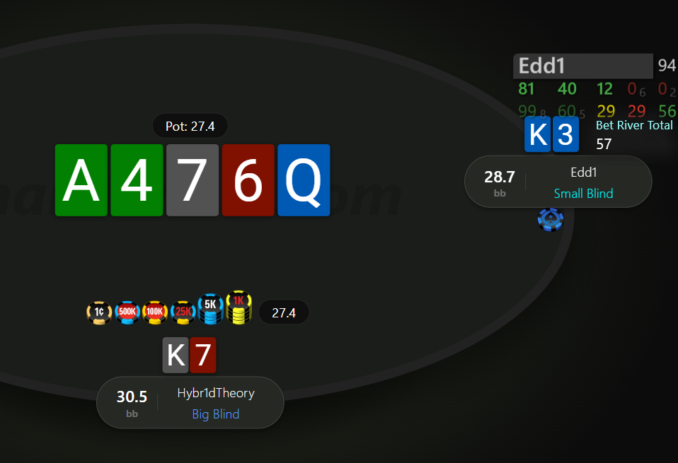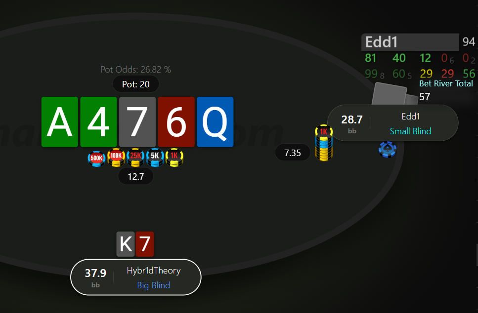 Після попередньої роздачі опонент зміг оговтатися і зрівняти стеки, проте він вперто не хотів змінювати свою гру і продовжував агресію, хоча було видно, що це вже дається йому через силу. Оп рейз, я на ББ кол з K7o.