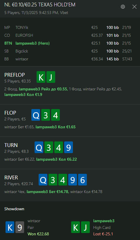 він закінчився в + і це вже непогано але чесно кажучи якось важко, майже усі грали обережно і прям відбитих гравців не побачила основний + зробила на префлоп виставленні КК > ДД тобто просто пощастило